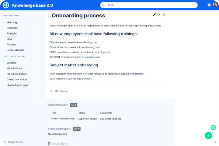 It's the perfect way to access a company's knowledge, integrated into Easy Project and delivers a powerful toolset to organize and scale documentation, manuals, processes, quality management and other needs to maintain knowledge within an organization.