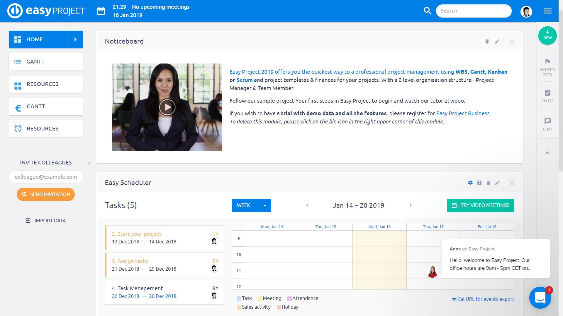 New Lite version represents the quickest & easiest start to professional project management. Just 2 predefined roles help you to start really fast and it's ready to grow with your projects when you are ready. After signing up free for Easy Project 2019 Lite, you will see 5 predefined tasks. By completing them, you will create, run and manage your own first project.