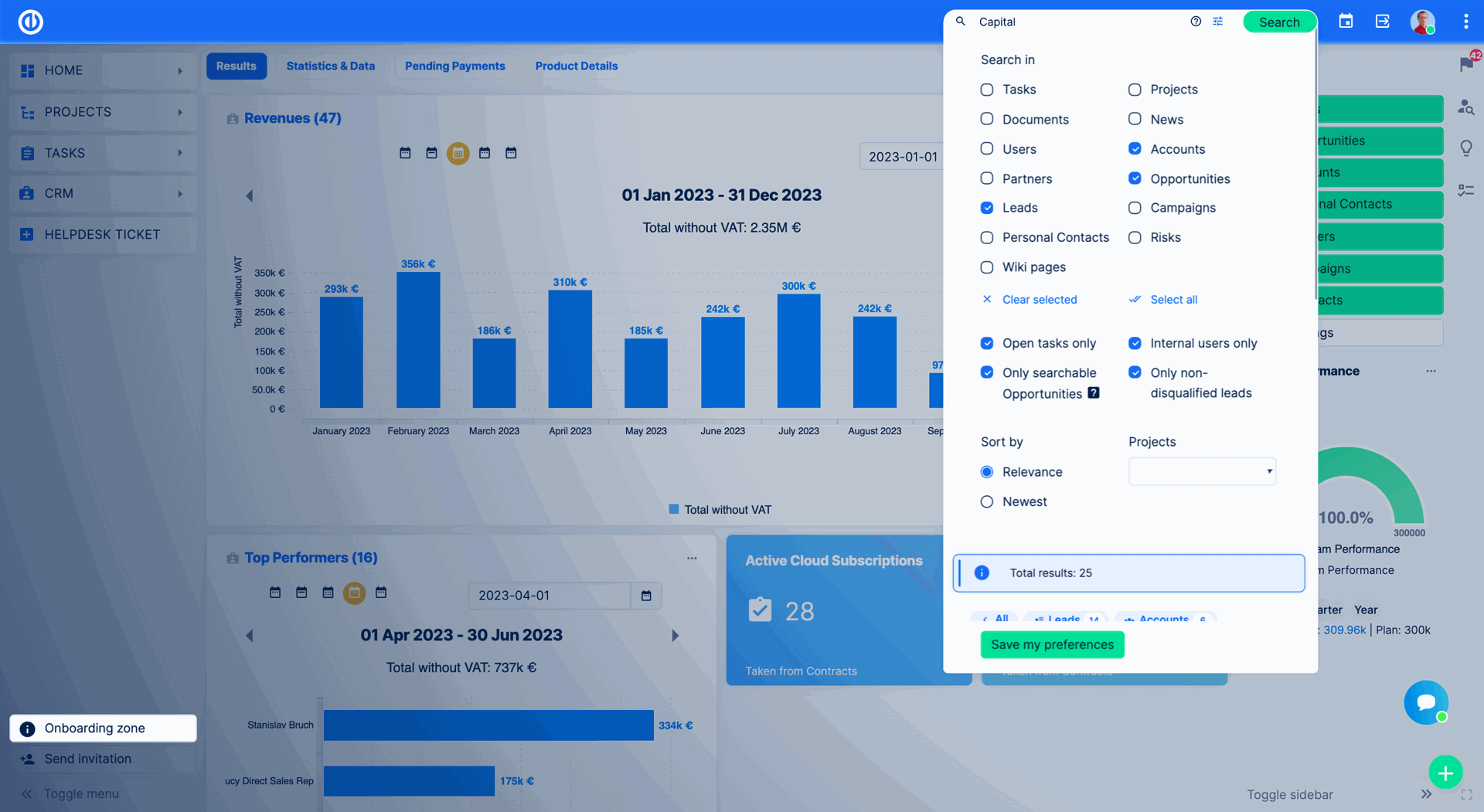 - Search customization – Every user is different, often depending on the department you work in. That's why you can now customize! If you work in sales, set up your search e.g. for “Accounts” or “Leads”, developers should choose “Tasks”, and project managers “Projects”.