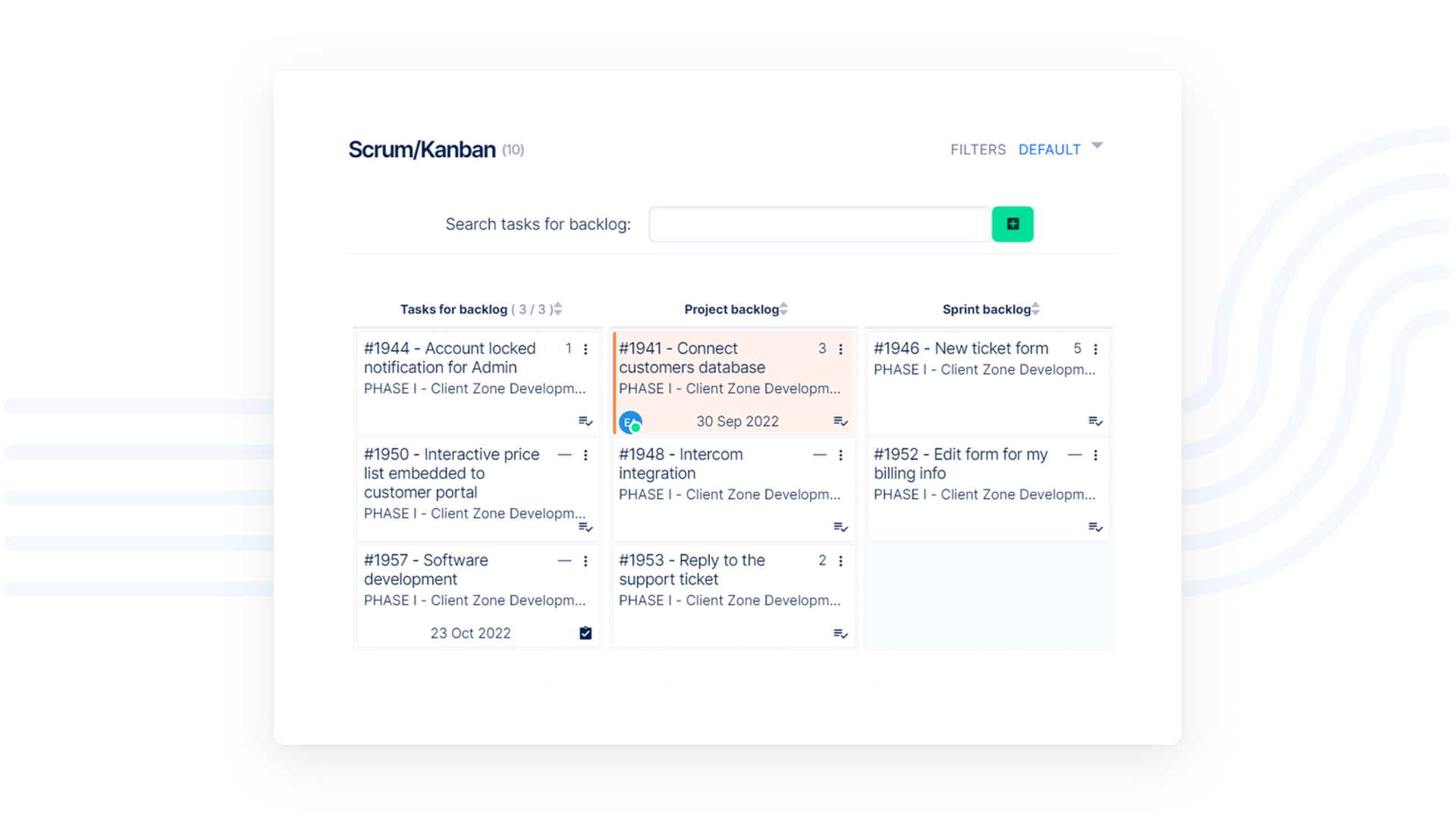 Das Agile Board zeigt Aufgaben und gibt Ihnen eine klare und anpassungsfähige Art der Betrachtung, Verwaltung und Berichterstattung über die laufenden Arbeiten. Wählen Sie zwischen SCRUM oder KANBAN - um von ihren einzigartigen Vorteilen und Features zu profitieren.