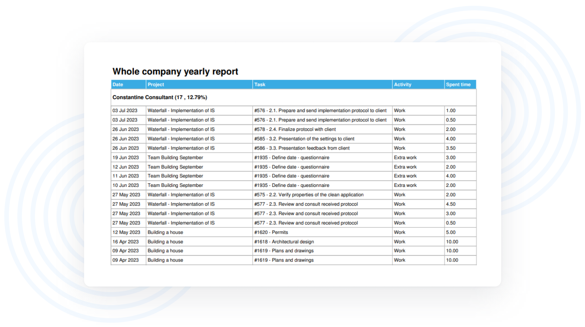 Alle Datenauflistungen aus dem System können mit Ihrem Logo und Ihren Firmenfarben in eine PDF-Datei exportiert werden. Beispiele für Exporte: Aufgabenlisten, Projektlisten, Zeitaufwandseinträge, Aufgabendetailexporte, etc.