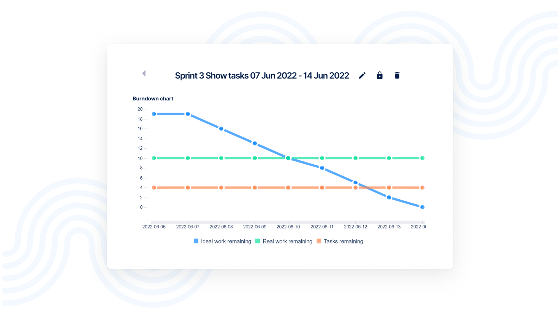 Führen Sie eine eingehende Analyse der Fortschrittsmuster für den rechtzeitigen Sprintabschluss mit Burndown Chart durch. Vergleichen Sie ideal versus echte verbleibende Arbeit, identifizieren Sie ein Arbeitsmuster und stellen Sie sicher, dass das Sprint-Engagement reibungslos erfüllt ist.