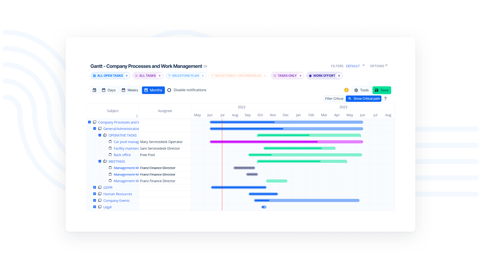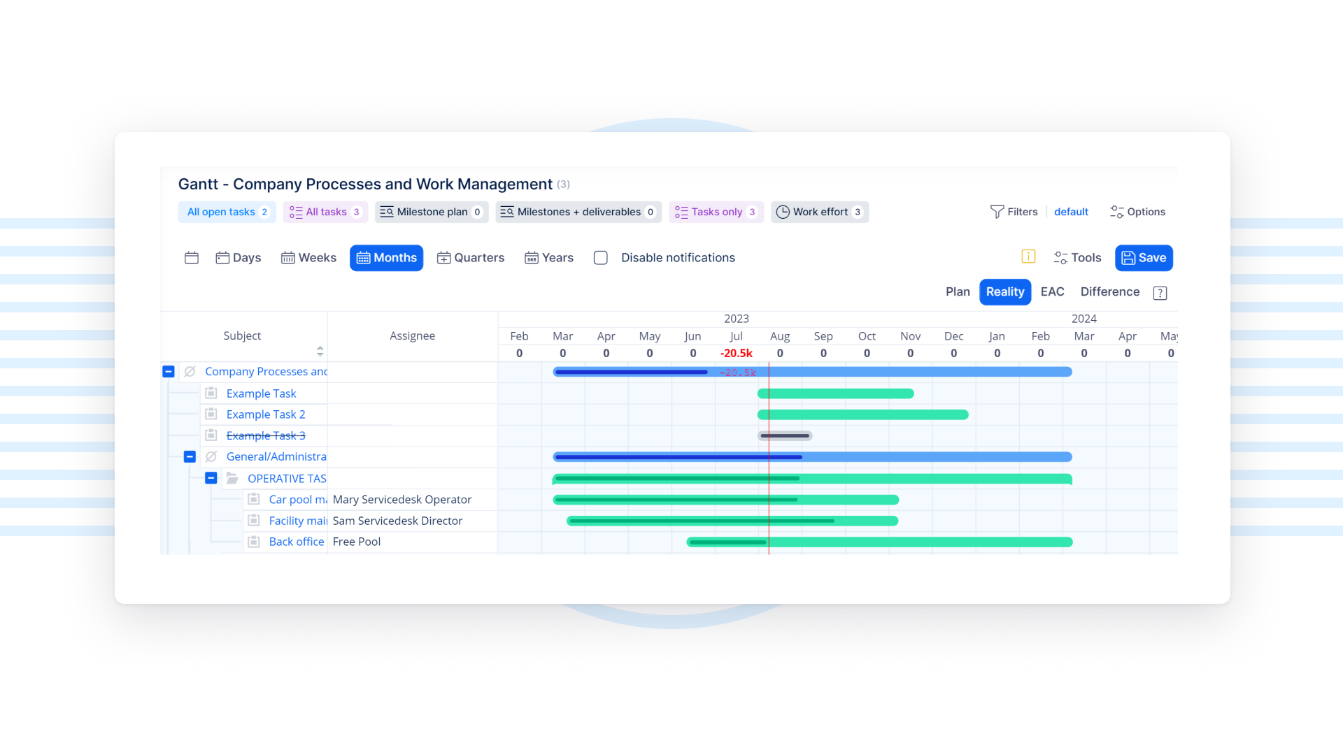 As a CEO it is important to get a quick and complete overview of the company performance at one glance, without the need of going through endless lists of data. Easy Project allows you to transform any data into a chart to compare planned performance to actual with Gauge diagram and to quickly access additional modules like Meetings Calendar and HR dashboard.