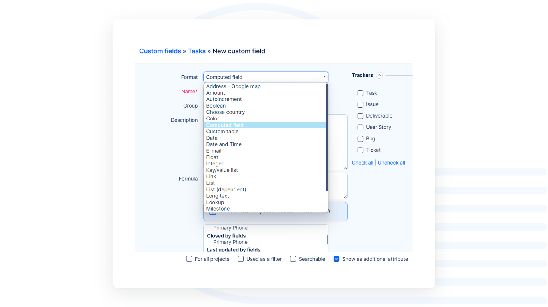 Machen Sie sich Easy Project zu eigen, indem Sie benutzerdefinierte Felder an Ihre persönlichen Bedürfnisse anpassen. Diese können auf einer Vielzahl von Einheiten erstellt werden und können je nach Tracker und Eigenschaft erscheinen.