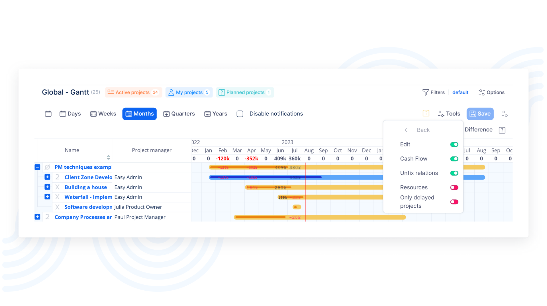 Ein Muss für jeden Portfoliomanager - Globales Gantt, für genau geplante Projekte und ein Adler-View-Management. Es ermöglicht Ihnen aktuelle versus geplante Performance, Ressourcen und Cash-Flows, die für jedes Projekt ausgegeben werden, sofort zu sehen.