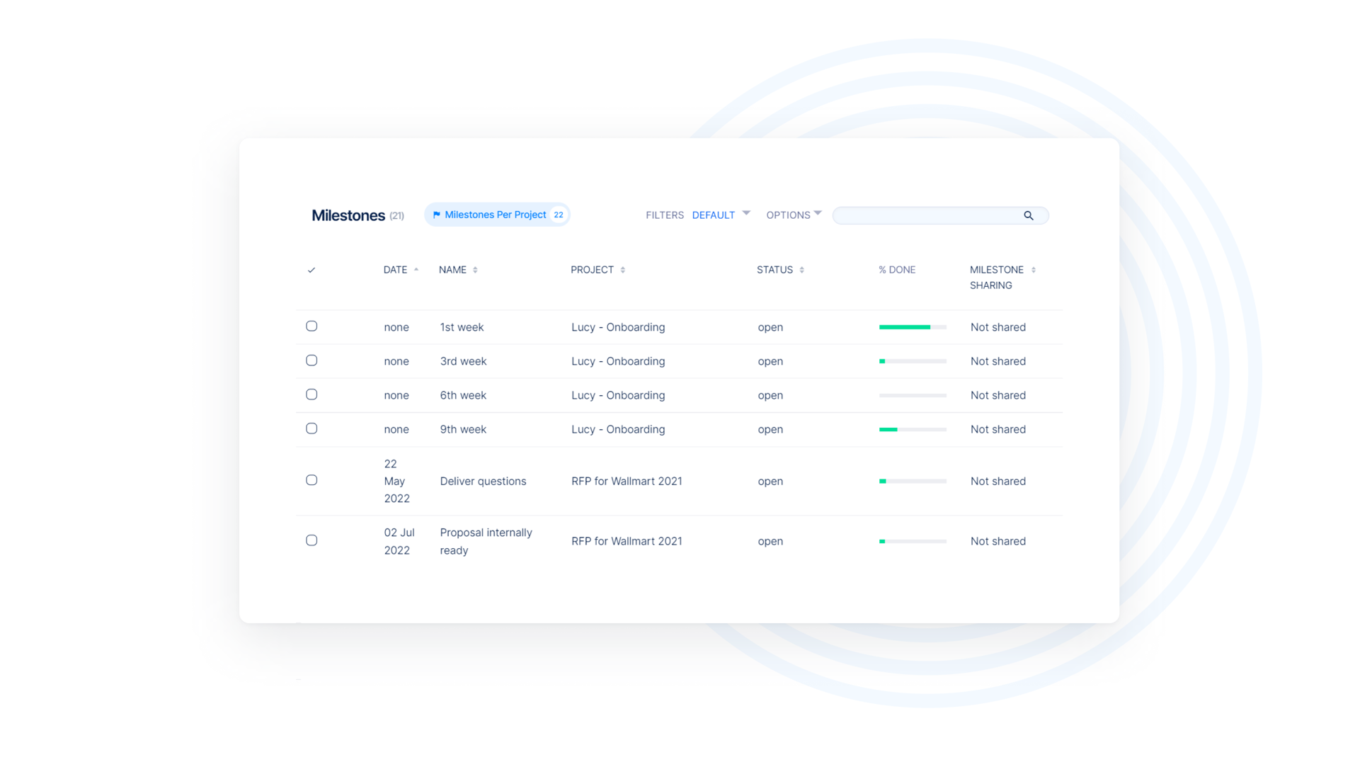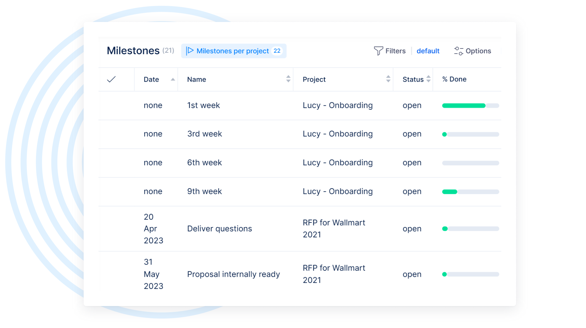 Erhalten Sie einen Überblick über Ihre Projektziele in Form von Meilensteinen und allen Aufgaben, die für die erfolgreiche Durchführung abgeschlossen sein müssen. Mit der Projekt-Roadmap erhalten Sie einen sofortigen Überblick über den gesamten Projektplan.