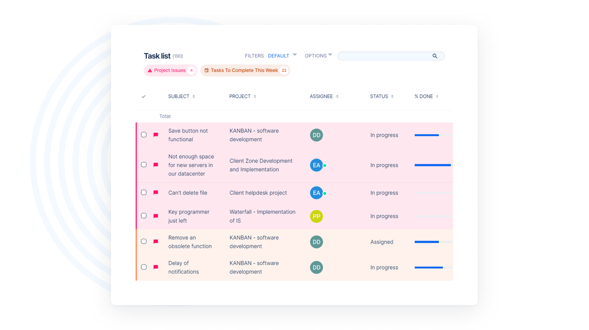 Get pre-set Easy Dashboard created to meet the needs of even the busiest project managers. Get an instant overview of the open & pending issues, together with a graphical illustration of the projects' statuses. Activity feed shows the latest updates and features like meetings calendar, resource management and more just one click away.