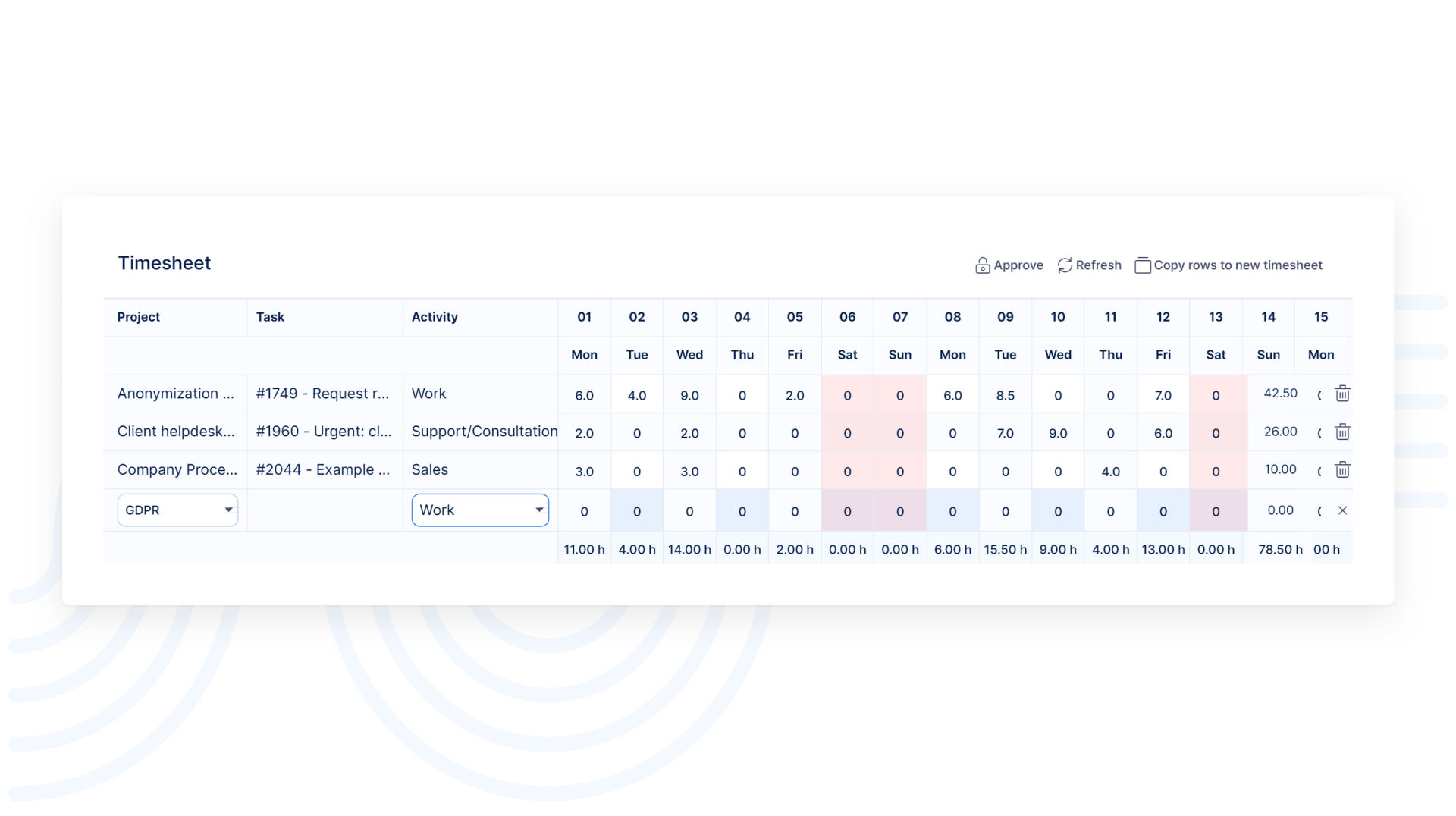 Zeiterfassungsbögen bieten eine einfache Möglichkeit, Zeitberichte zu Projekten oder Aufgaben zu erstellen. Benutzer können wöchentliche Arbeitszeitnachweise erstellen und sie kontrollieren und genehmigen.