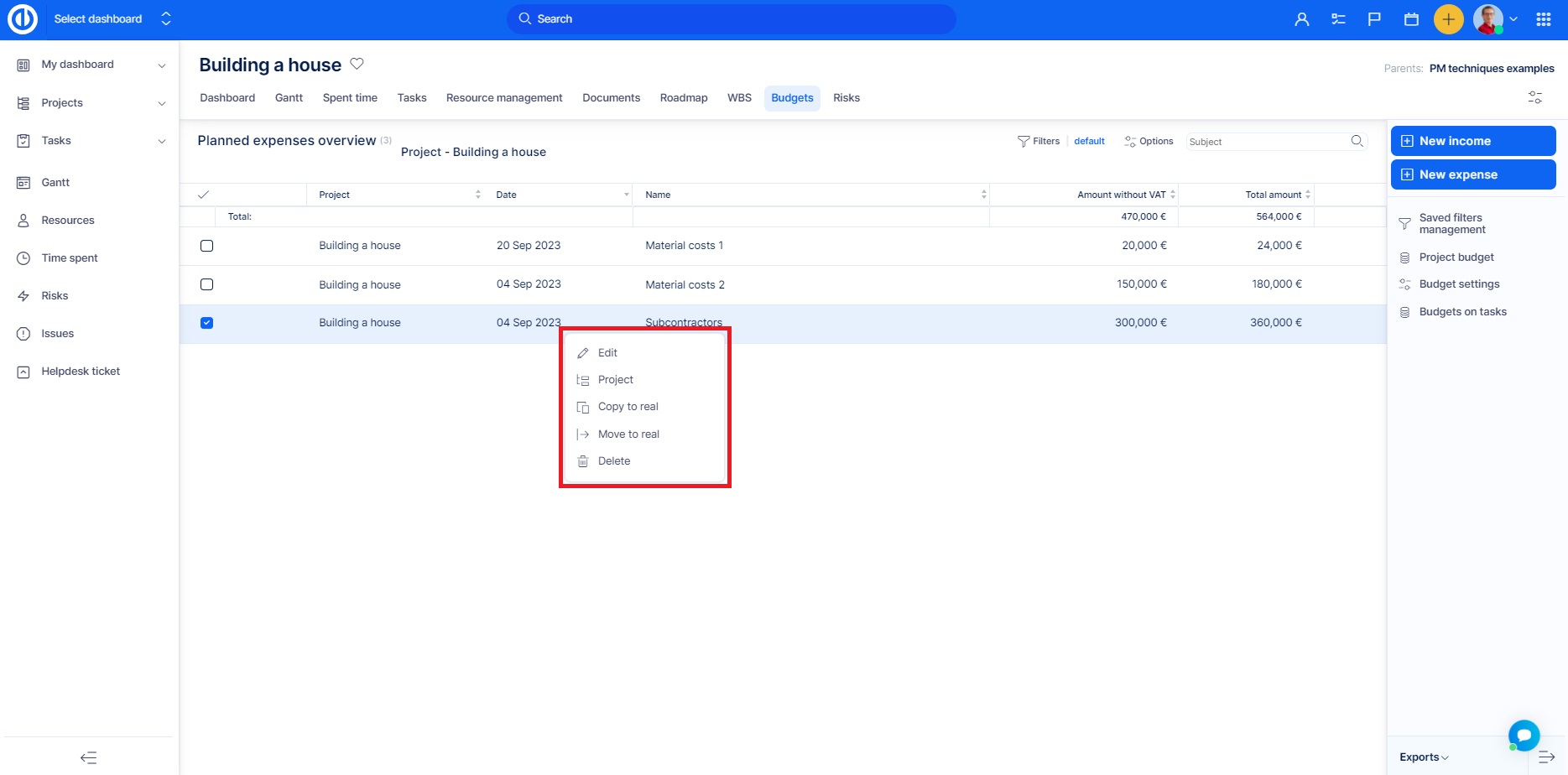 To make planned income/expense a real one, open overview of planned incomes/expenses on a particular project, click on the particular item (income, expense) with the right mouse button and select "Move to real" or "Copy to real" as illustrated below. In the same menu, you can also change project for this particular item.