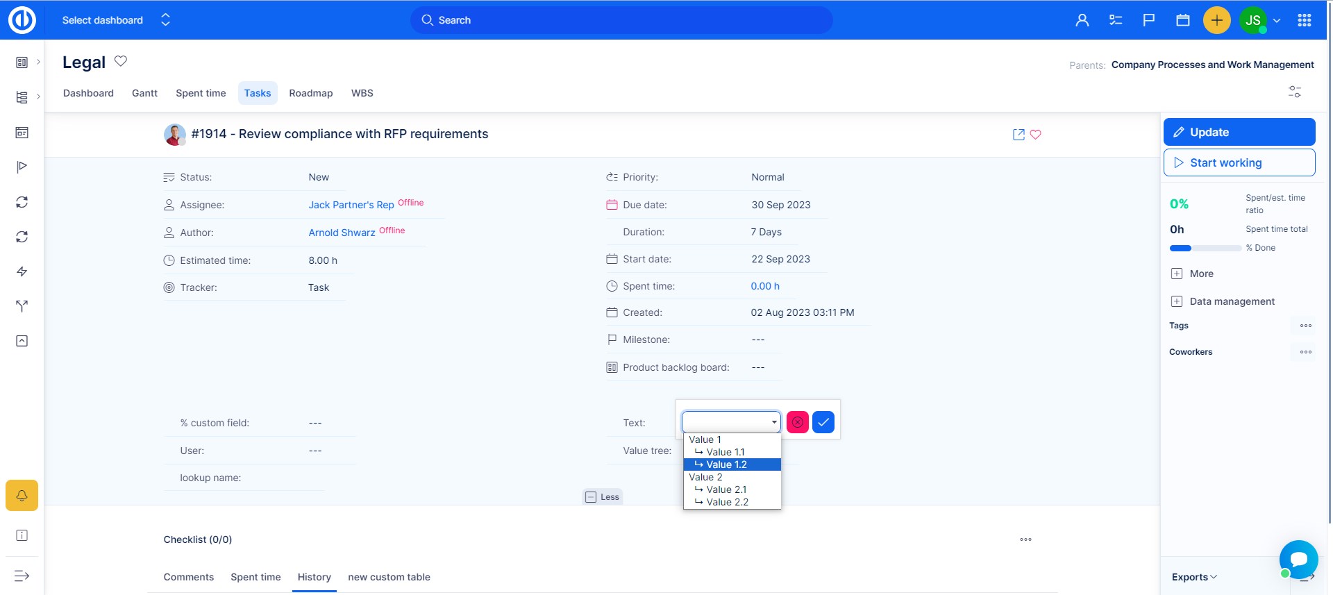 This custom field allows you to select any existing user from a drop-down list or checkboxes. A custom field of the format User only works correctly on project-linked entities like Tasks, Spent time, Milestones, Documents, and Projects. When created on a different entity, no users are visible in the custom field. In such a case, use Lookup custom field instead of User custom field.