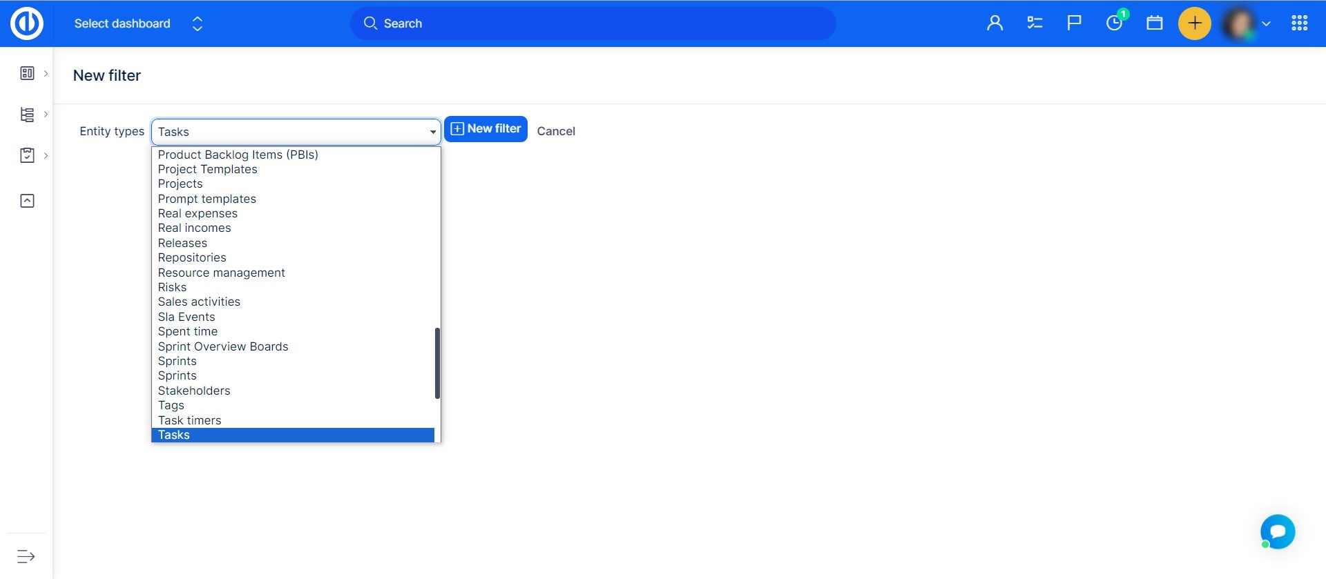 There are more situations where you come across filters in Easy Project, such as dashboard personalization. As you know, you can easily personalize your dashboard by adding, adjusting and removing widgets from the selection. Some of these widgets contain filters to show you sought-after results only. The most common widgets with filter settings are Attendance, Tasks from filter, CRM cases by filter, Documents, Knowledge posts, all Users, and Money widgets . There is also a widgets called Saved filters list where you select which types of private and public filters will be easily accessible directly from your dashboard. The filter settings in dashboard personalization might look like this. After clicking on "Save page and go back" button, you will see clearly filtered data like this.