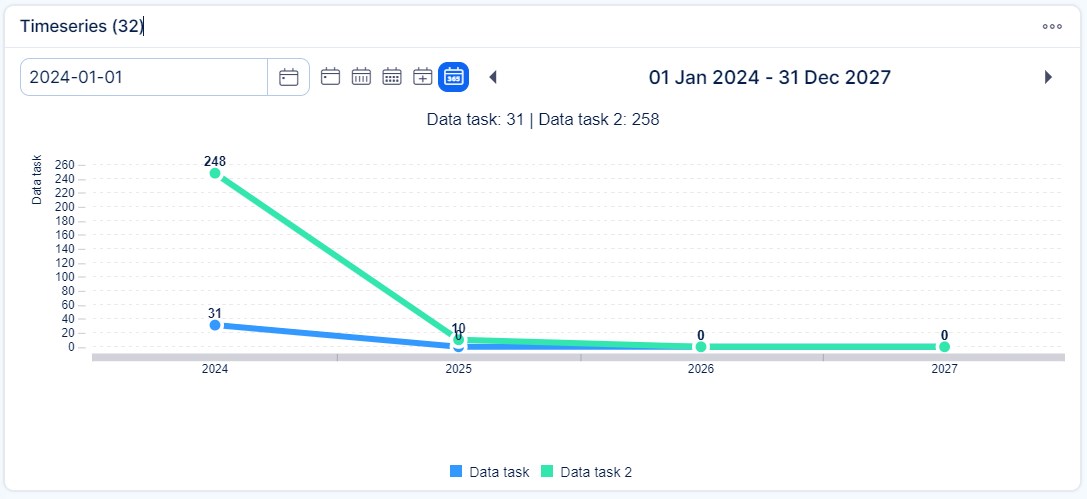 The best thing on timeseries is that you can view any number of various entities in one chart. For example a total performance chart, containing the sum of story points on closed tasks, project incomes by date, number of closed support tickets, amount of billable service hours, the total value of billable service hours, etc. Just think of the possibilities.