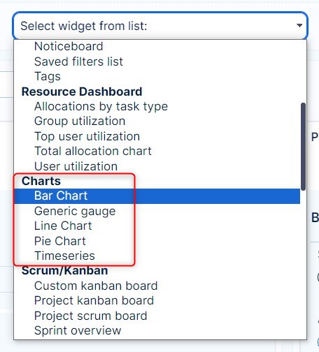 There are 5 basic types of charts: bar chart, generic gauge, line chart, pie chart, and timeseries. All of them might be added to any personalized dashboard. Just go to one and click the "Customise" button in the lower-left corner. Afterward, browse the list of widgets to add and select the appropriate type of chart right from there. In addition to those charts as independent widgets , there are also many other widgets (such as attendance, earned values, CRM cases, spent time, money, etc.) which also can be configured to show data using one of the selectable types of charts.