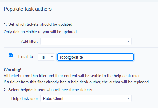 - If "Current logged user" is selected - the HelpDesk author will be set as the HelpDesk test user.