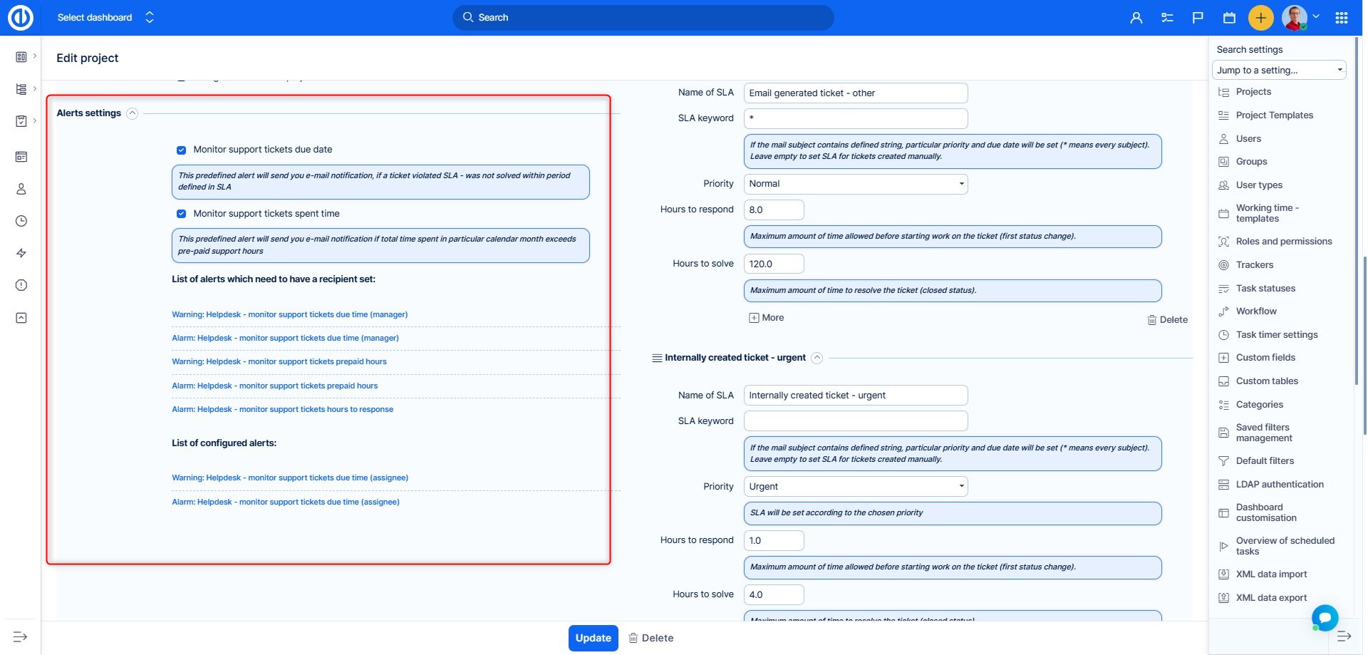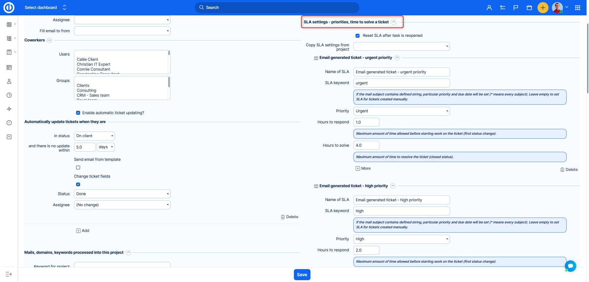 Depending on whether you want to have a single project for all tickets or differentiate HelpDesk mailboxes, or even have special projects for different clients, you need to decide about the structure of the projects before any configuration starts. This decision will affect some further steps listed in this manual.