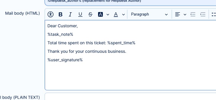 - You will likely continue using email templates to notify clients of ticket updates. Adding a link to the ticket for clients to access it will be helpful. The link is in the format: https://[your_application_URL]/easy_helpdesk_issues/%task_id_without_hash%.