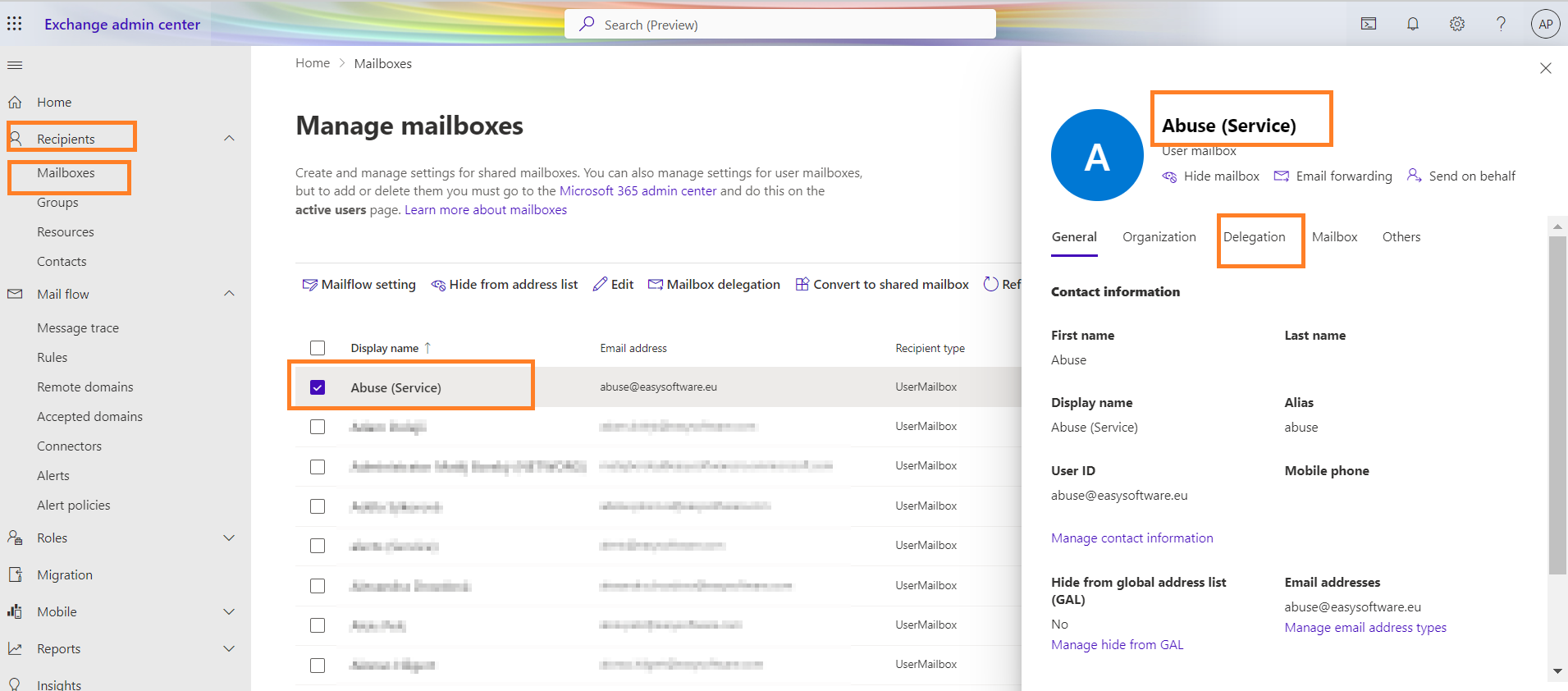 You will be redirected to the Exchange admin center section. Here, click on the Recipients >> Mailboxes tab and select the mailbox whose access right you want to delegate. A right pop-up sidebar will open and click Delegation.