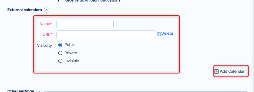 To add a new calendar click on the respective button. Fill in the name, URL and set visibility.