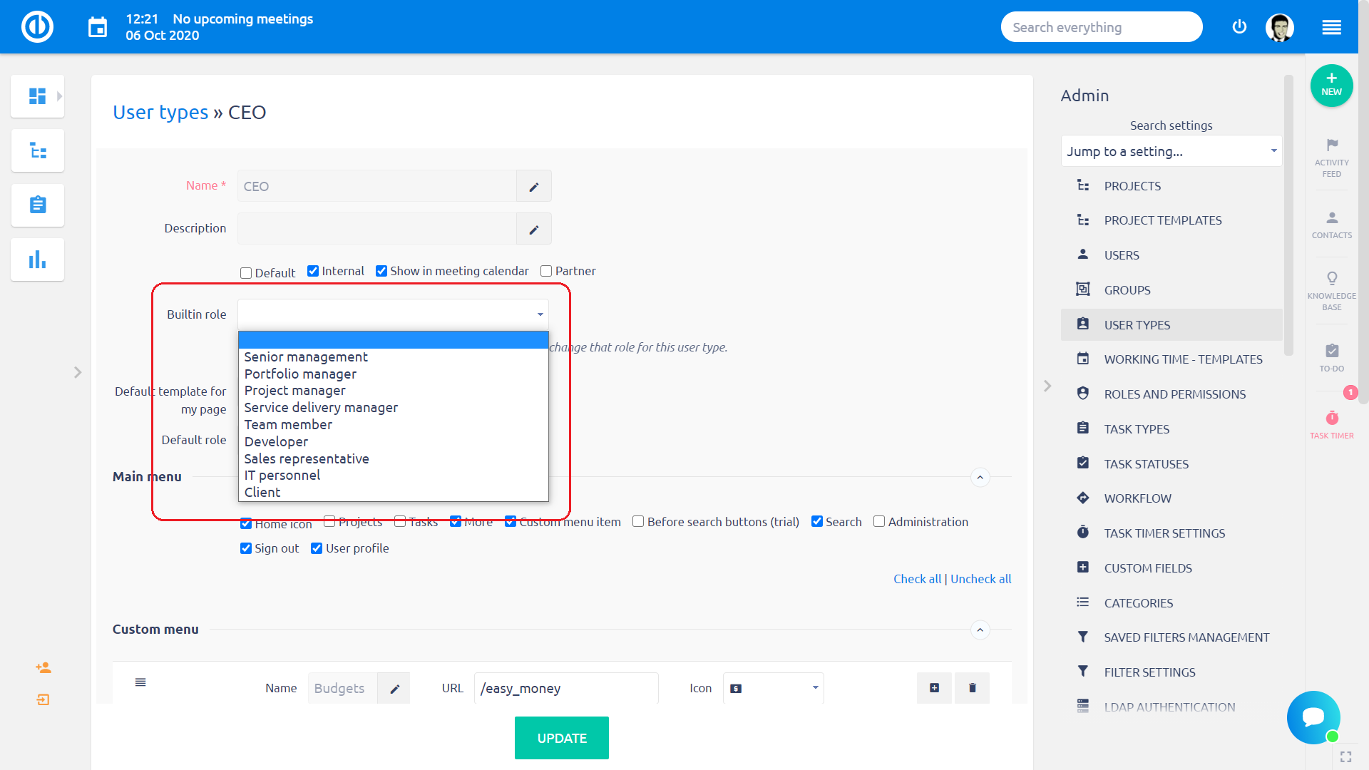 Toda organización cuenta con algunas personas clave que deben ser miembros de todos los proyectos debido al carácter de su trabajo (por ejemplo, directivos o RRHH). Para simplificar la administración de tales usuarios y ahorrarte tiempo, hemos introducido una nueva configuración de funciones integrada. Puedes añadir automáticamente usuarios específicos a cada proyecto en lugar de tener que realizar una configuración manual que requiere mucho tiempo. Los usuarios con el puesto integrado se mostrarán en una sección separada.