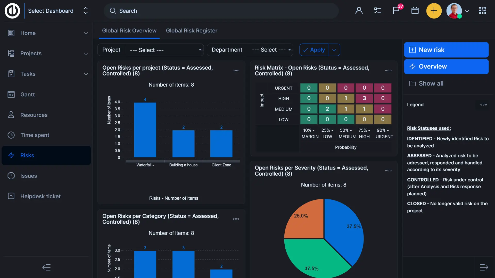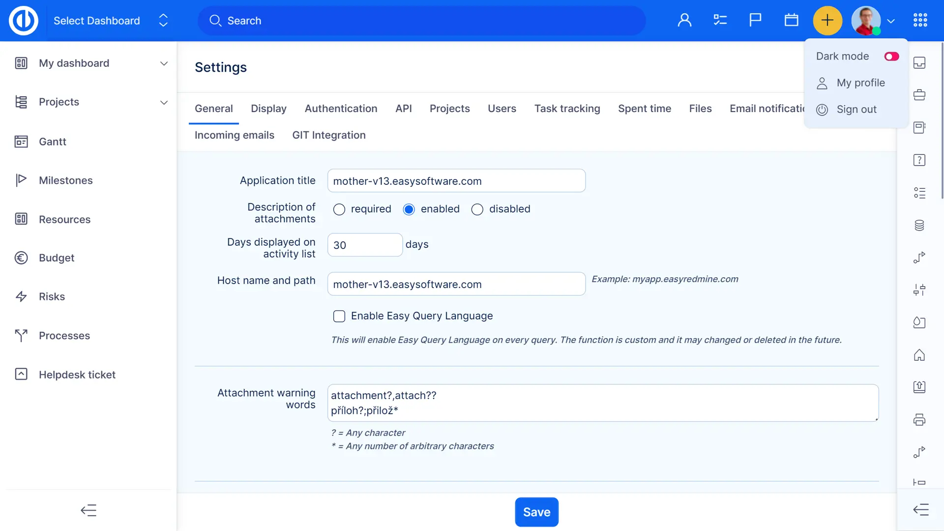 Easy Project viene con 3 temas de diseño para satisfacer las necesidades de varios usuarios: Predeterminado, Compacto y Oscuro. Cada usuario puede cambiar entre los temas de su perfil de usuario.