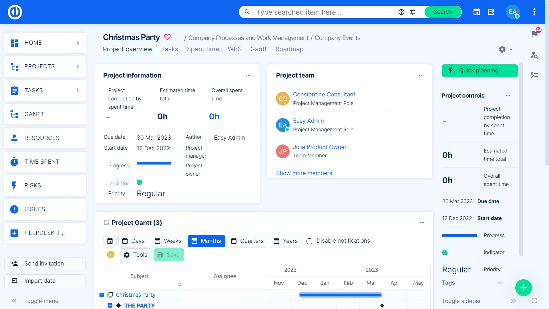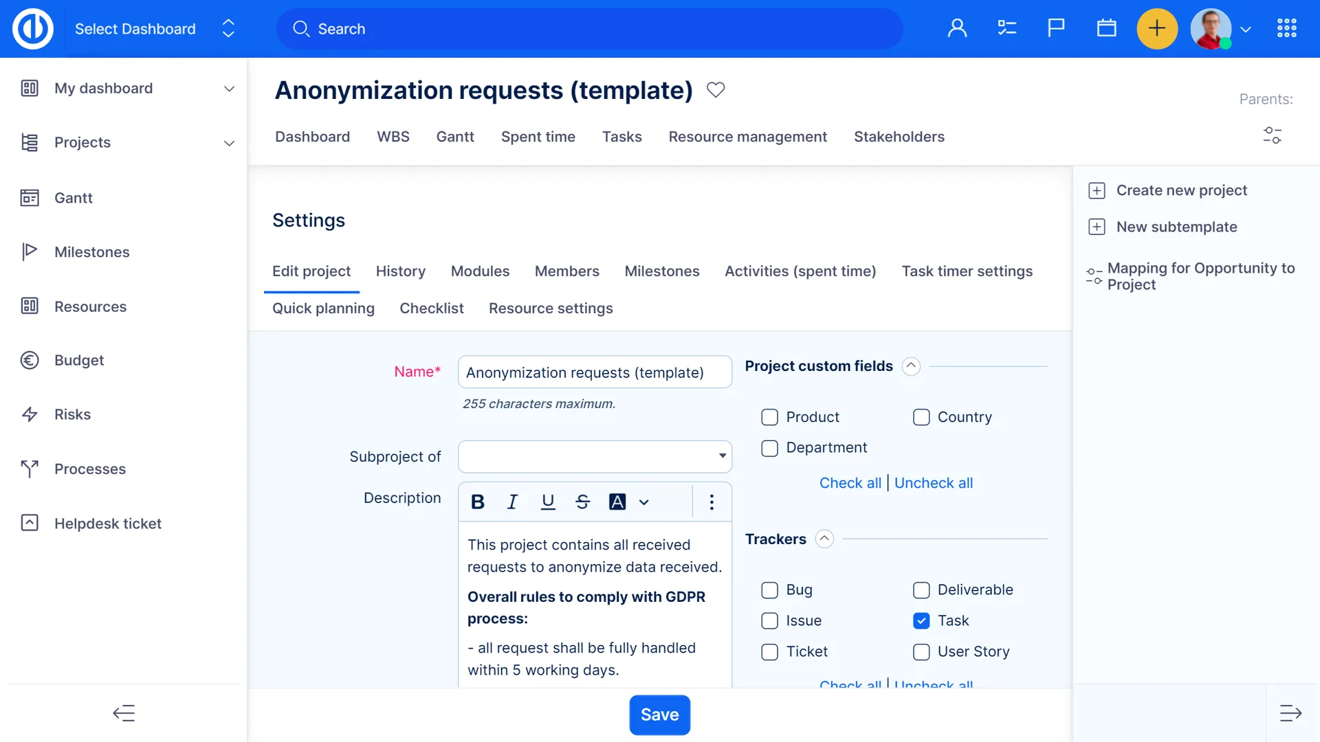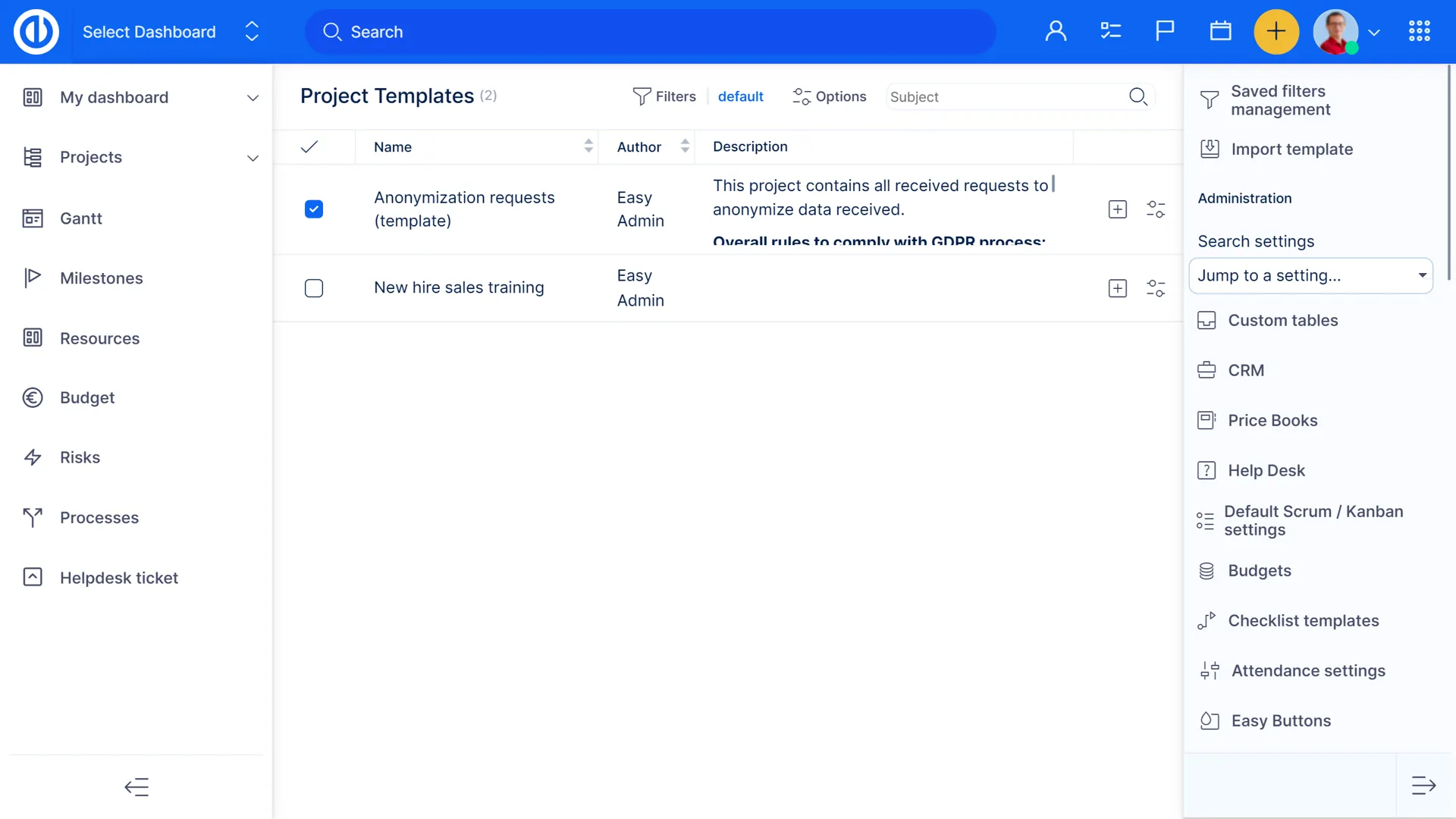 ¿Tienes un tipo de proyecto recurrente? Con Easy Project, puede crear plantillas a partir de un proyecto existente que incluya tareas, hitos, equipos, documentos, etc., o puede crearlas desde cero. Las plantillas le ahorran mucho tiempo y pueden mejorarse con el tiempo para garantizar una mejor entrega del proyecto. Con Easy Project, también ofrecemos una lista de plantillas de proyectos para procesos empresariales típicos, como recursos humanos, atención al cliente, estrategia y gestión de eventos, que le ahorran tiempo y le proporcionan una estructura de proyecto derivada de las mejores prácticas.
