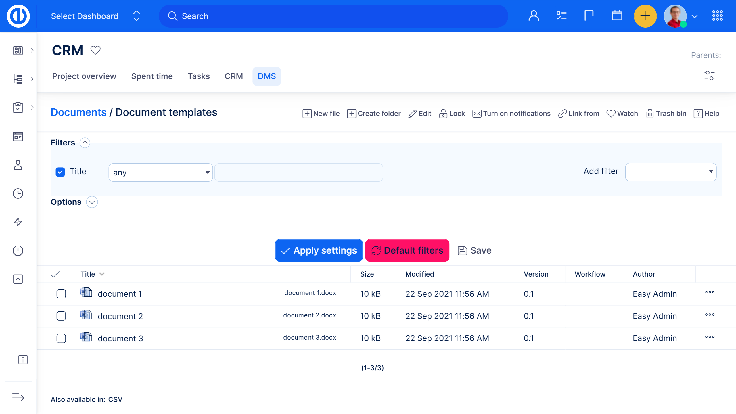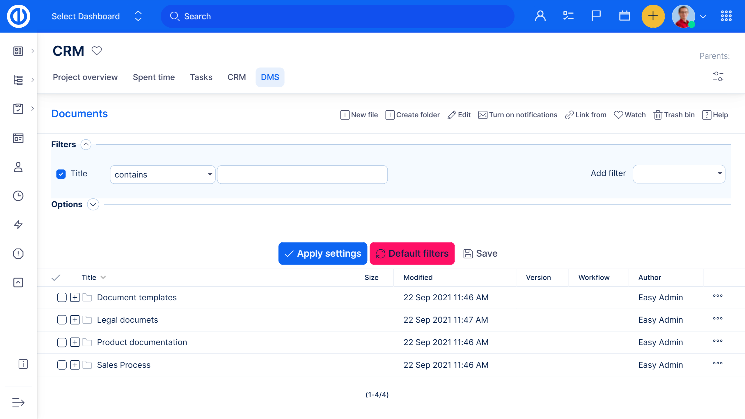 El complemento del sistema de administración de documentos proporciona acceso rápido a todos sus archivos y documentos y su administración directamente desde Easy Project. Está organizado en una estructura de directorio familiar y, gracias al control de versiones de documentos, tendrá todos sus documentos actualizados. Los flujos de trabajo de aprobación simplifican la circulación de los documentos en su empresa y simplifican su trabajo.