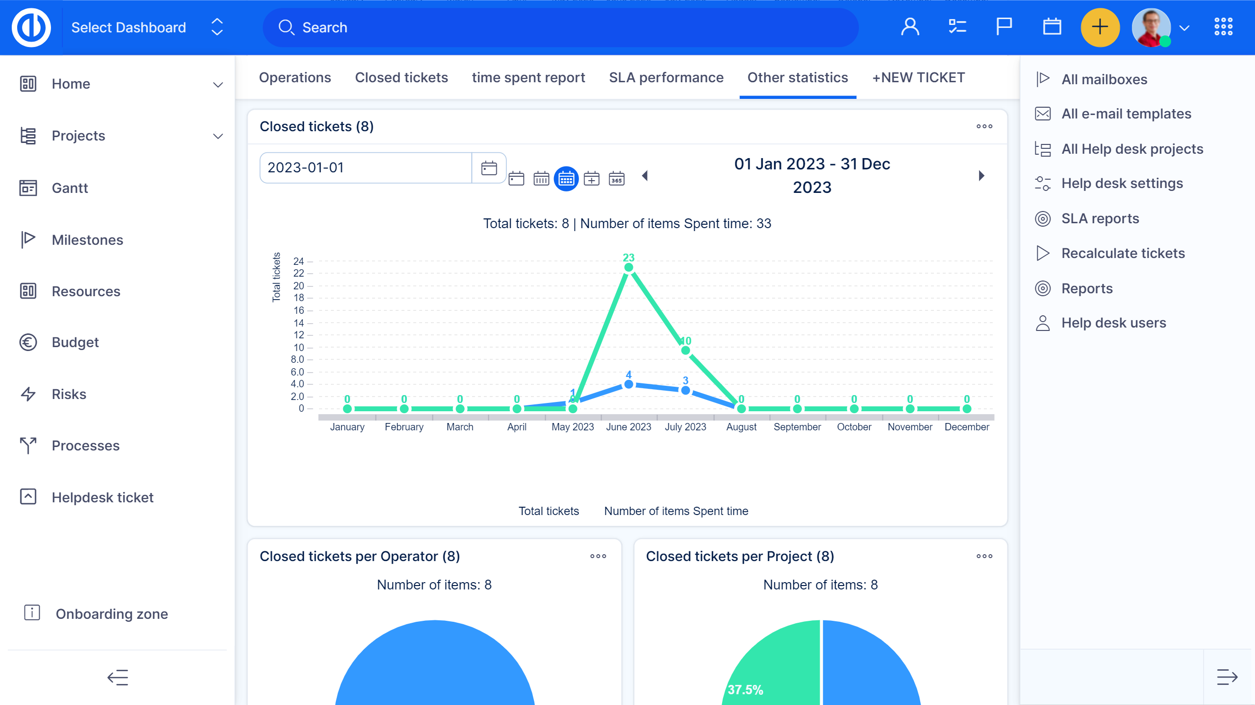 Obtén una visión general del rendimiento de tu servicio de atención al usuario. Las Estadísticas de Help Desk son personalizables, puedes ver el rendimiento por usuario y estatus, y comparar estadísticas de diferentes periodos de tiempo, lo que te permite realizar un análisis transversal del rendimiento.