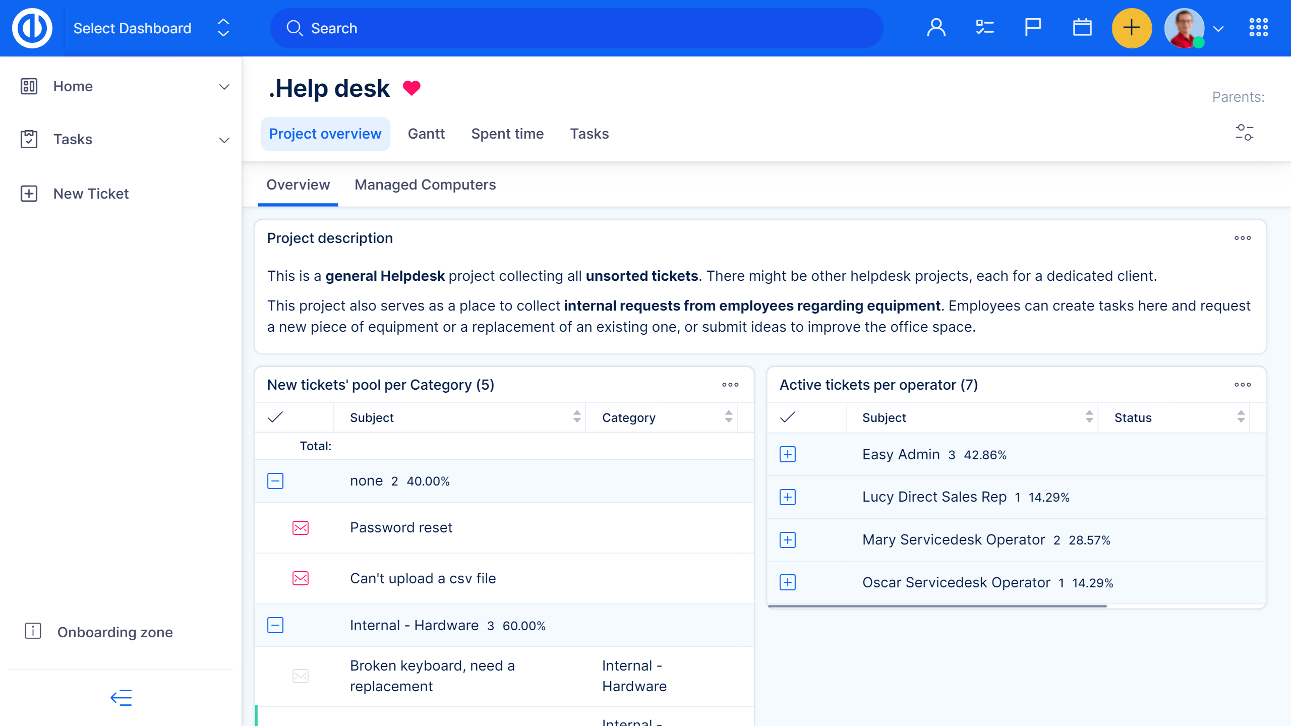 Consigue una solución integrada de Help Desk dentro de tu Easy Project. Los casos se pueden enviar a través de correo electrónico o directamente al sistema mediante la cuenta de cliente y se almacenan en el proyecto Help Desk, con SLAs definidas, horas prepagadas, etc. Además, utilizando los Botones de Acción puedes asignar casos a los trabajadores mediante la herramienta de arrastrar y soltar.