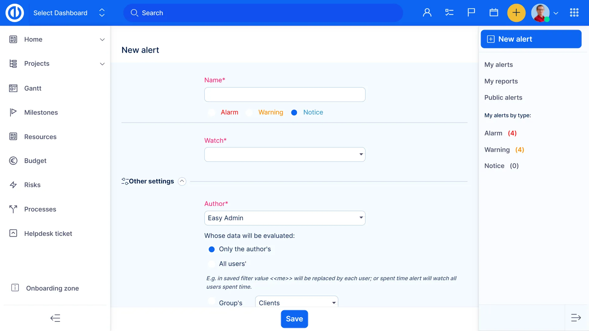 Vous définissez quoi et quand vous souhaitez être averti et vous recevrez une notification par e-mail au bon moment. Par exemple: une échéance approche, un budget projet / tâche est dépassé, les tâches sont échues.