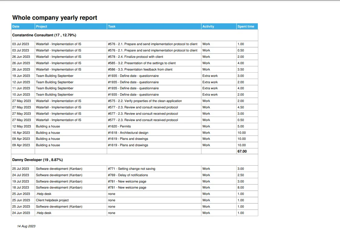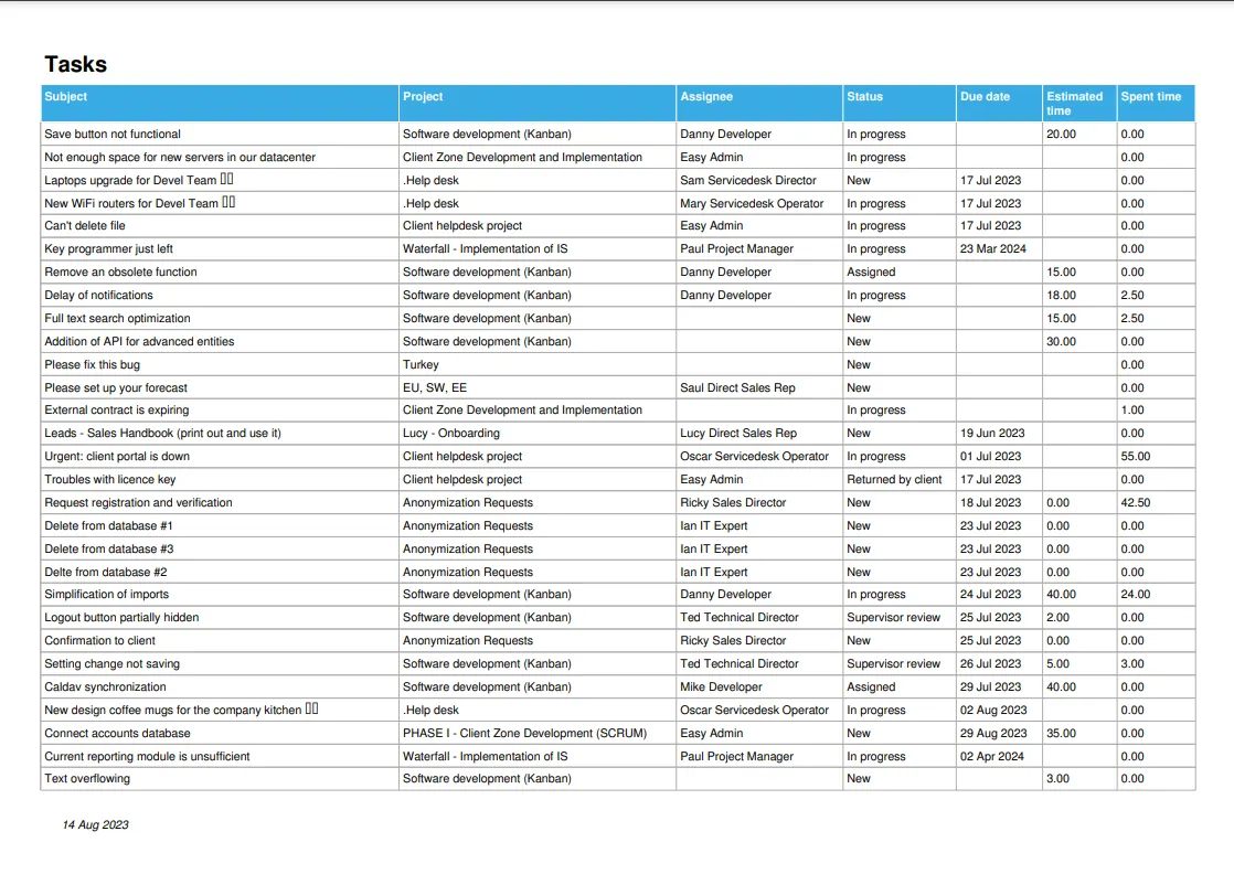 Toutes les listes de données du système peuvent être exportées dans un fichier PDF avec votre logo et les couleurs de votre entreprise. Exemple d'exportations : tout type de liste de tâches, liste de projets, entrées de temps passé, exportation du détail des tâches, etc.