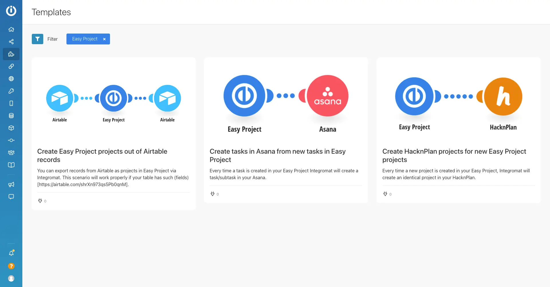 Intégrez Easy Project avec des systèmes tiers en utilisant une automatisation visuelle et sans code du flux de travail. Nous le faisons pour vous. C'est très simple et vous gagnez du temps.