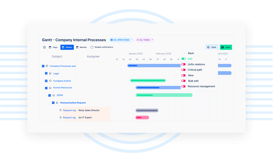 Simplify complex processes using Gantt Chart. In Easy Gantt you can plan and adjust deadlines using drag & drop, create tasks, set milestones, determine relations, assign sub-tasks – making the process faster, more visualized and harmonized.