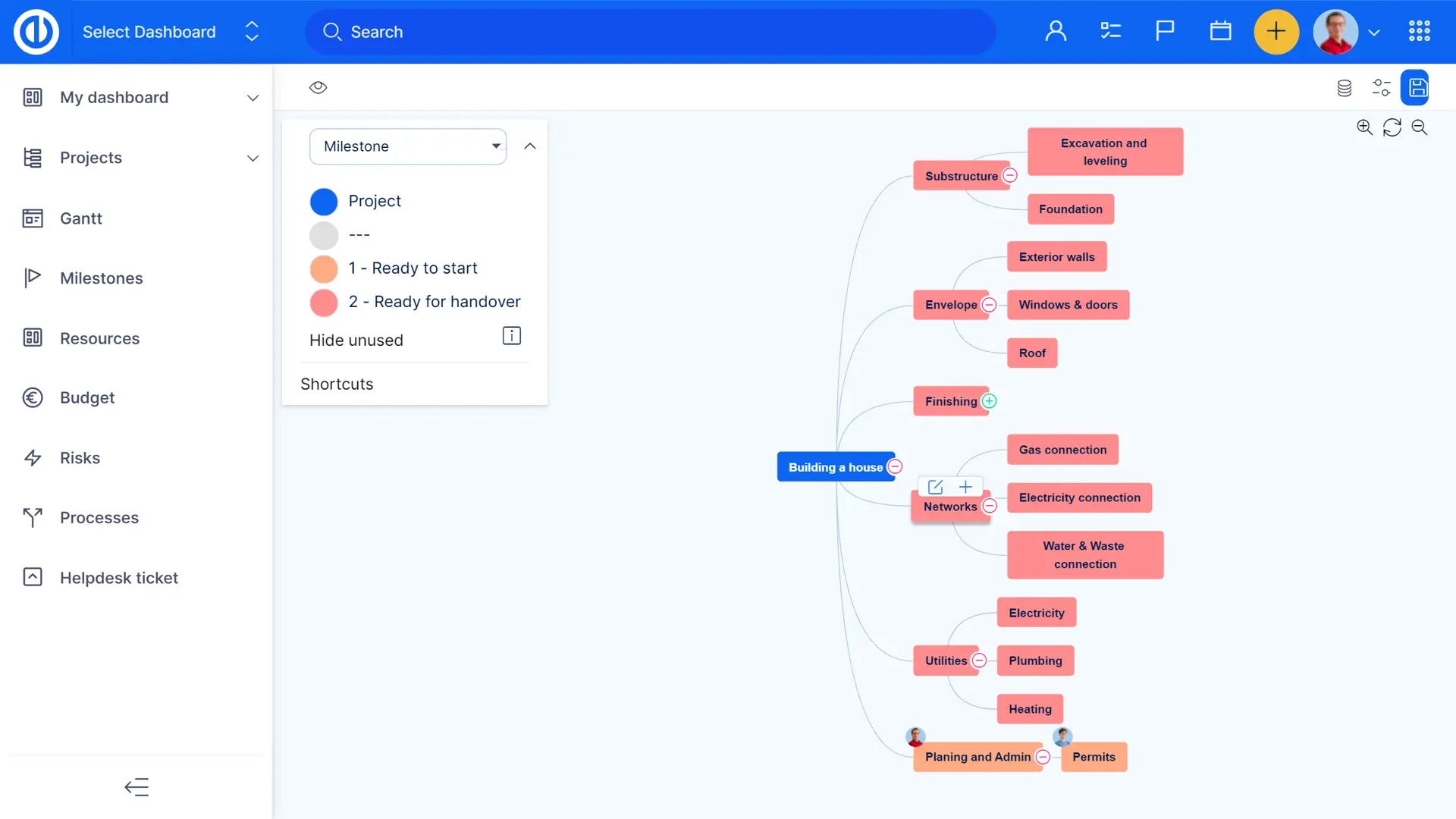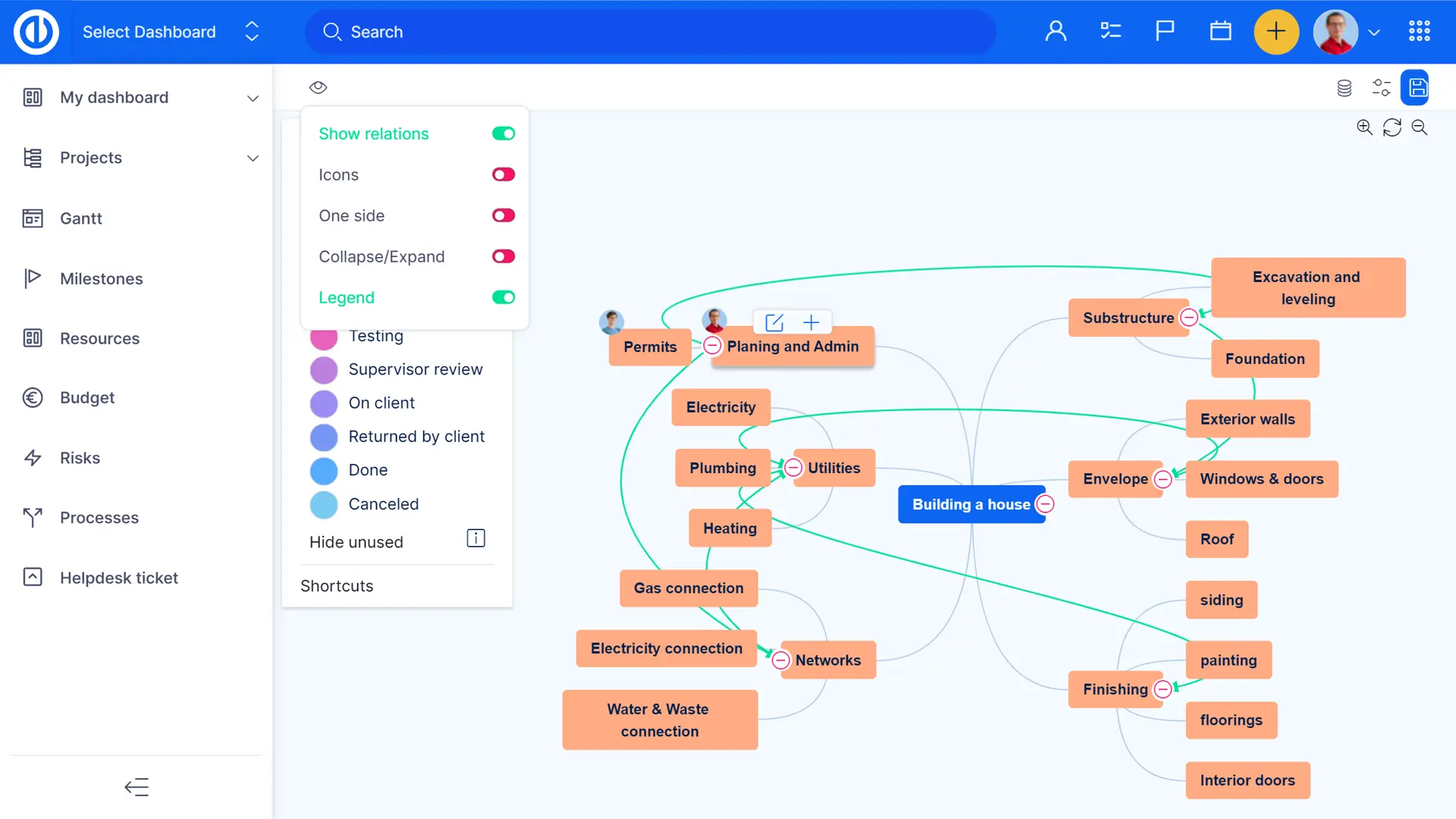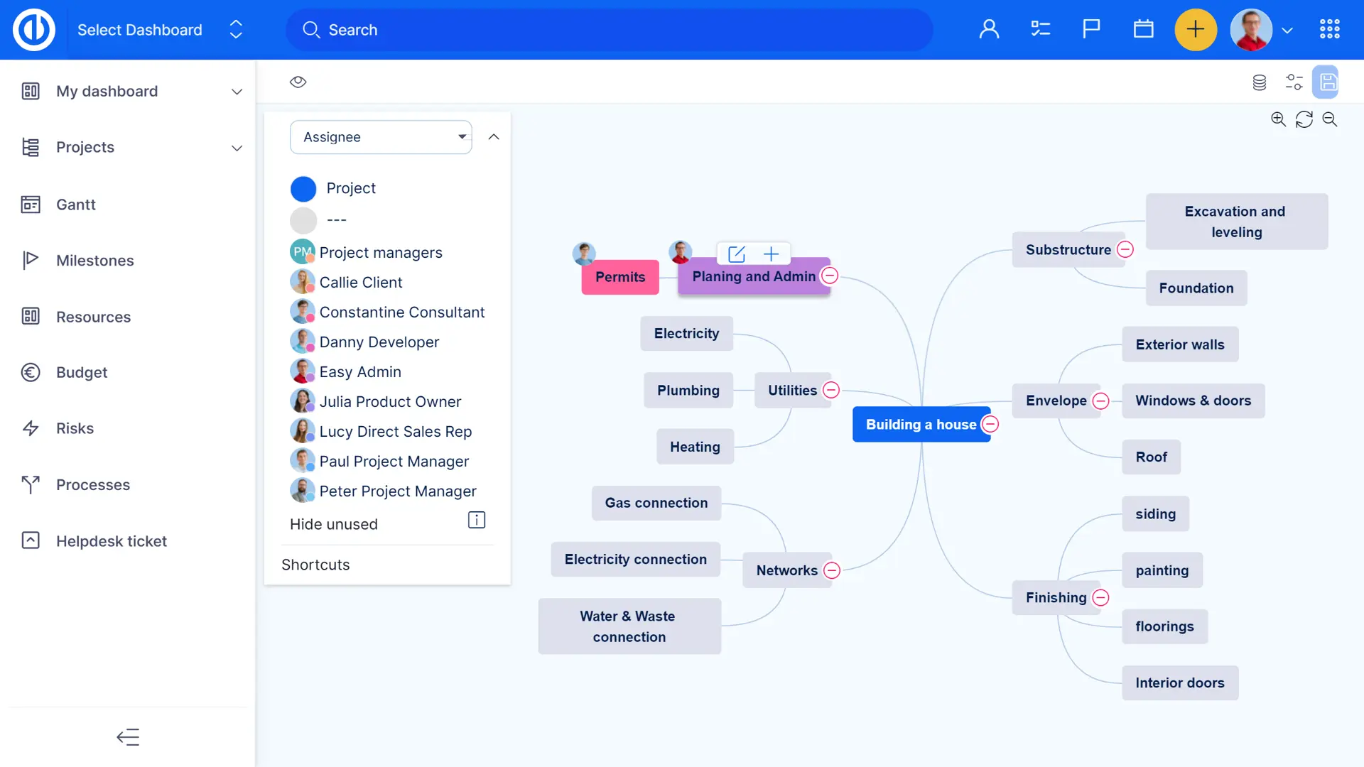 - Visualizzazione come una Mappa Mentale dei progetti, problemi, e sotto-problemi