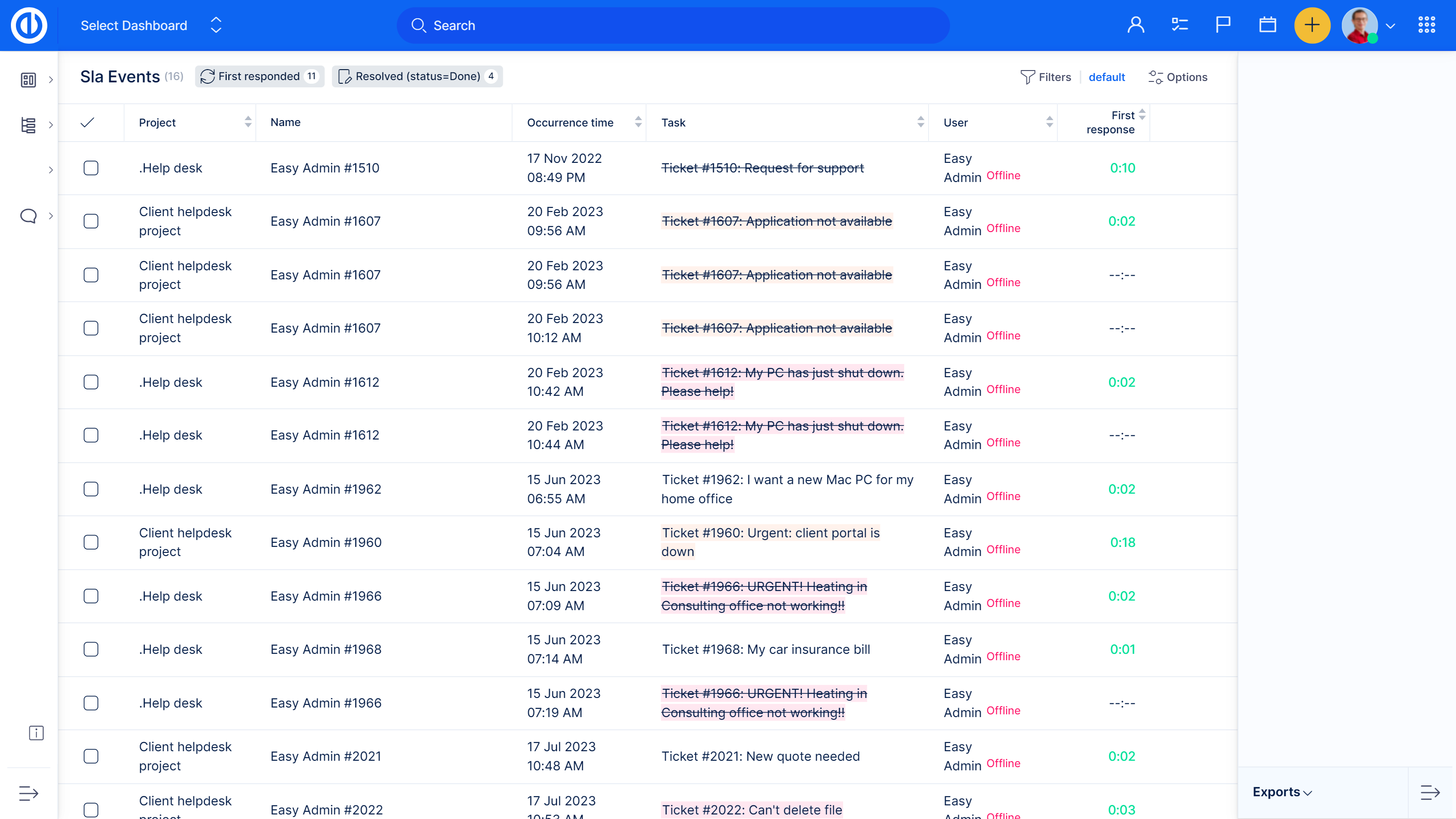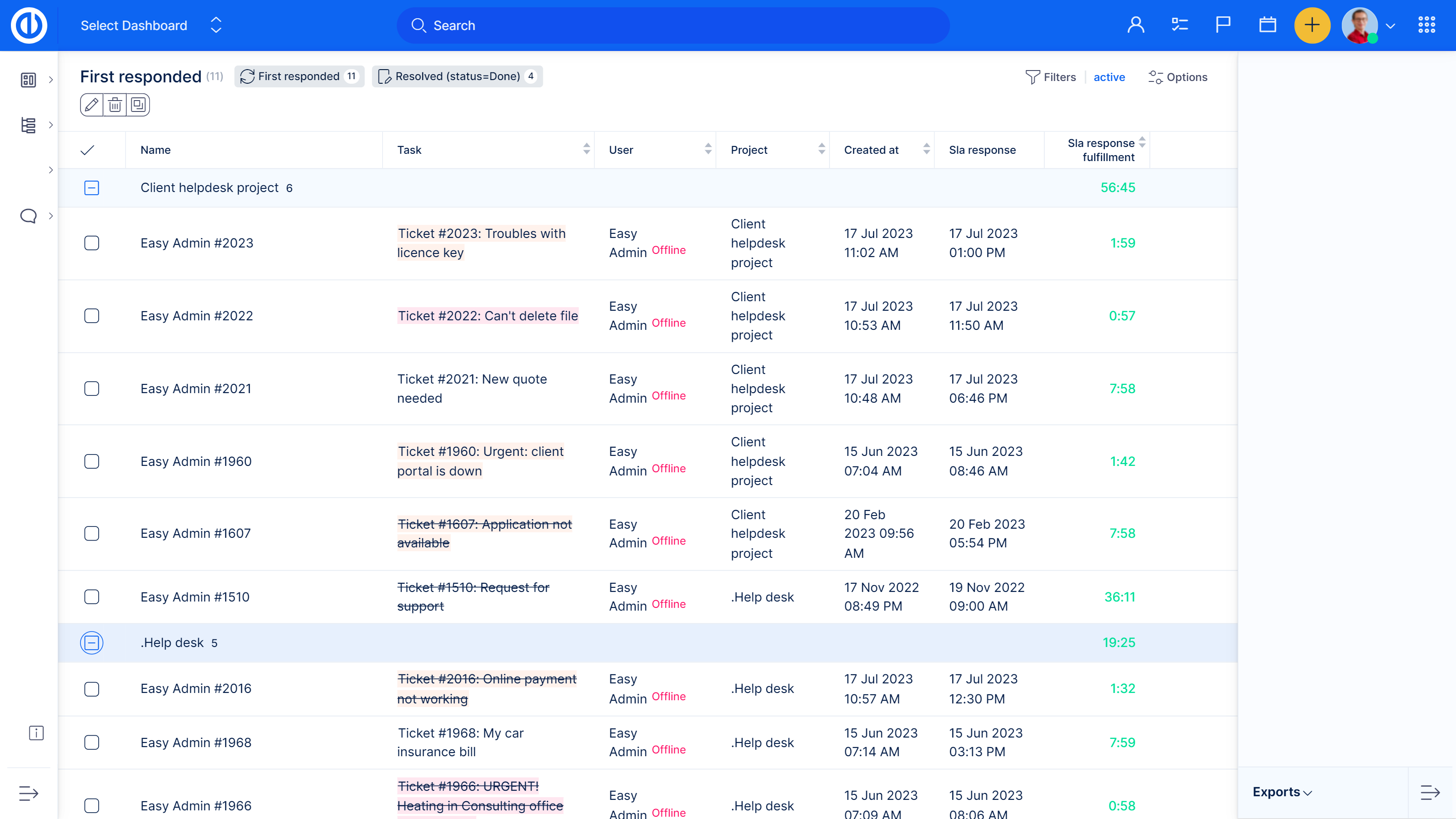 - Rapporti sulle prestazioni degli SLA suddivisi per proprietari di biglietti e assegnatari