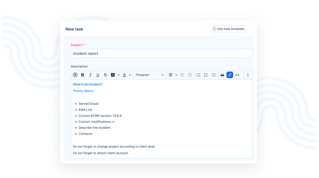 Task templates transform repetitive work into efficient, reusable templates, enhancing project consistency and saving valuable time. This feature streamlines your operations, reducing errors and boosting productivity across diverse project types.