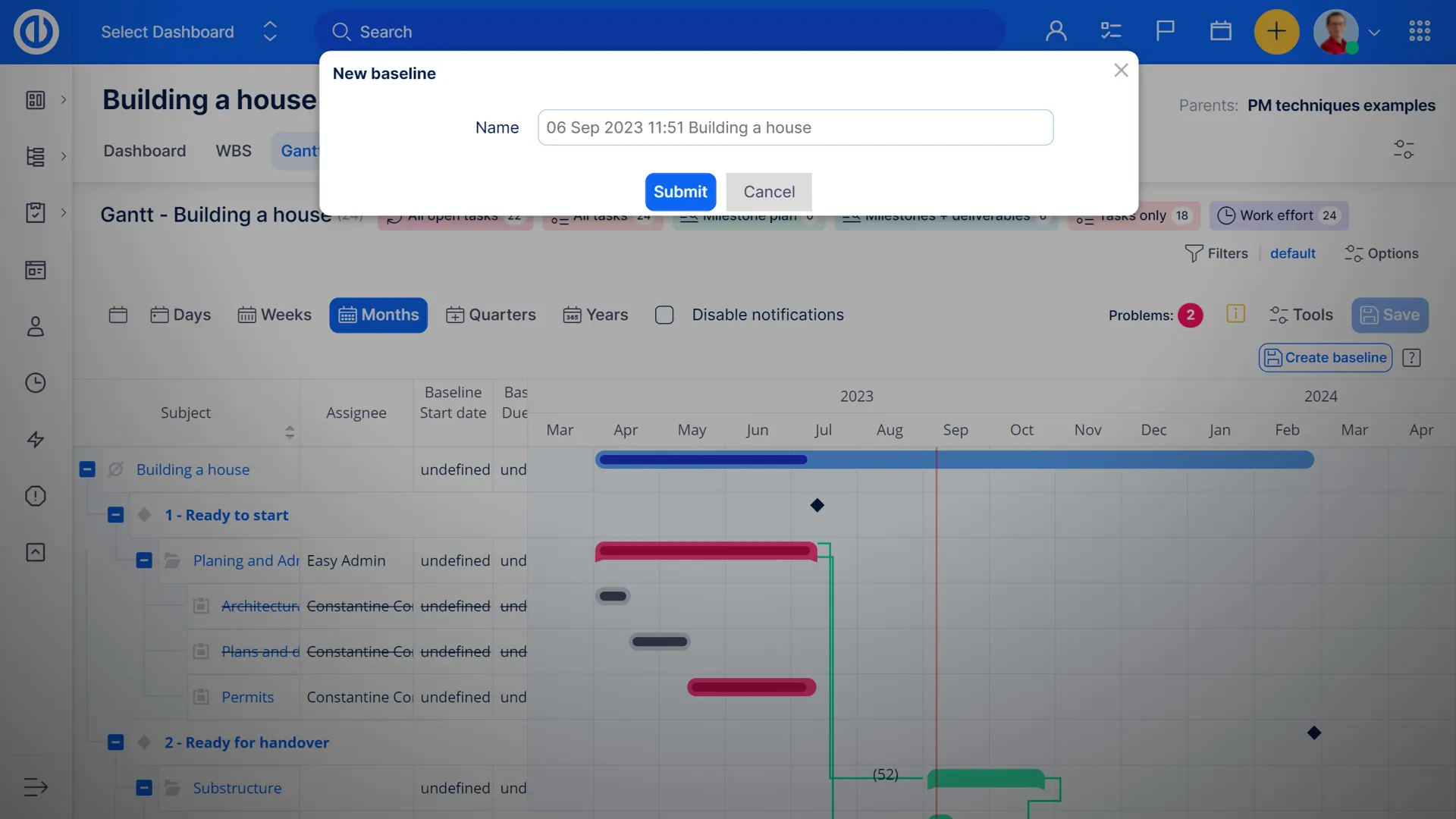 Assess project performance by comparing it to the original plan. Baselines provide snapshots of the project plan at different moments, allowing you to easily compare the plan to current performance within your Gantt chart.
