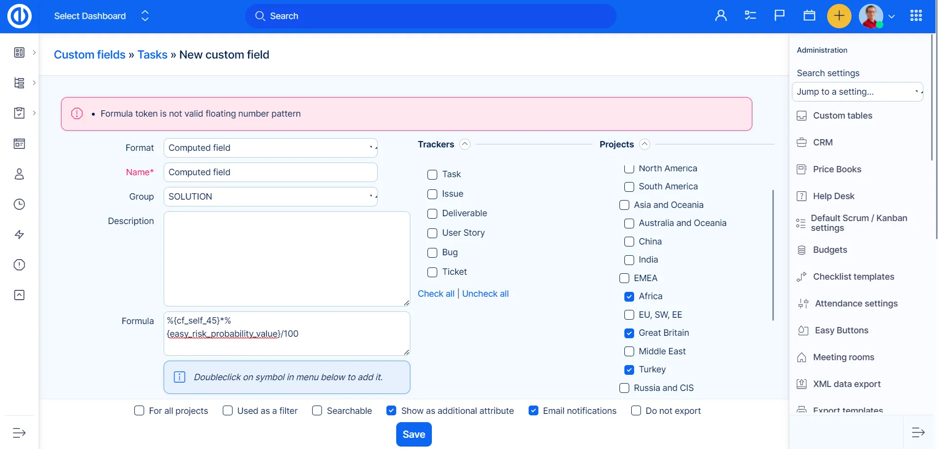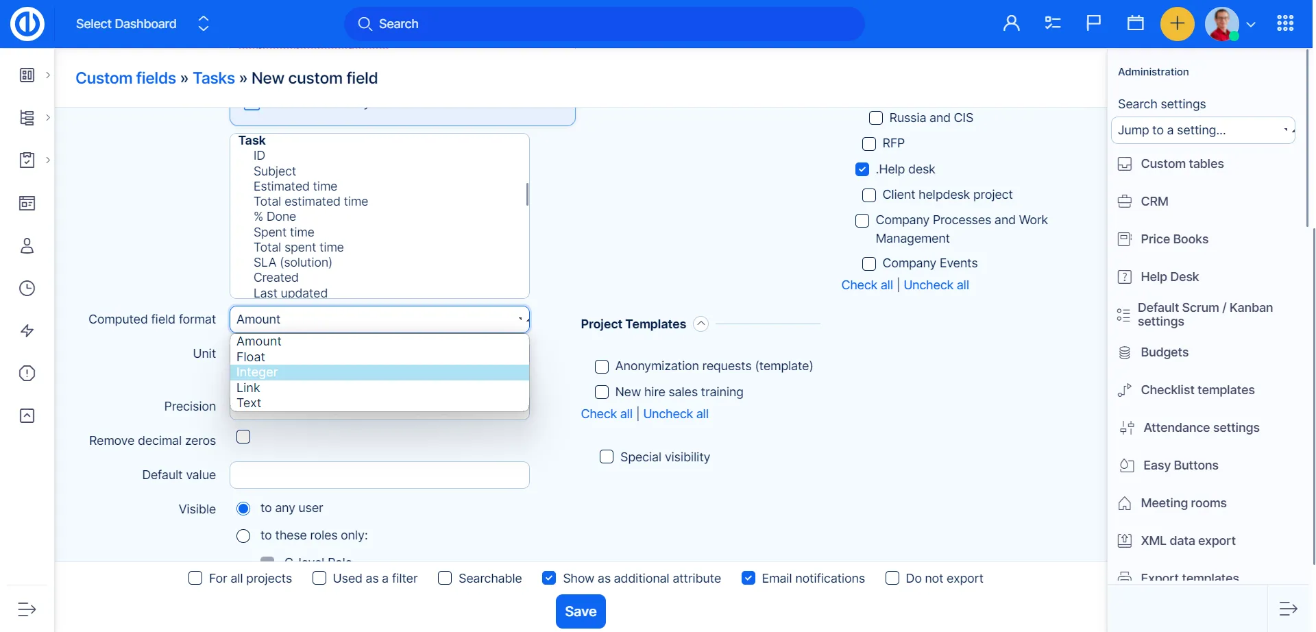 Make Easy Project your own by creating computed fields customized to your personal needs. They can be created on a variety of entities and can appear depending on trackers and attributes.