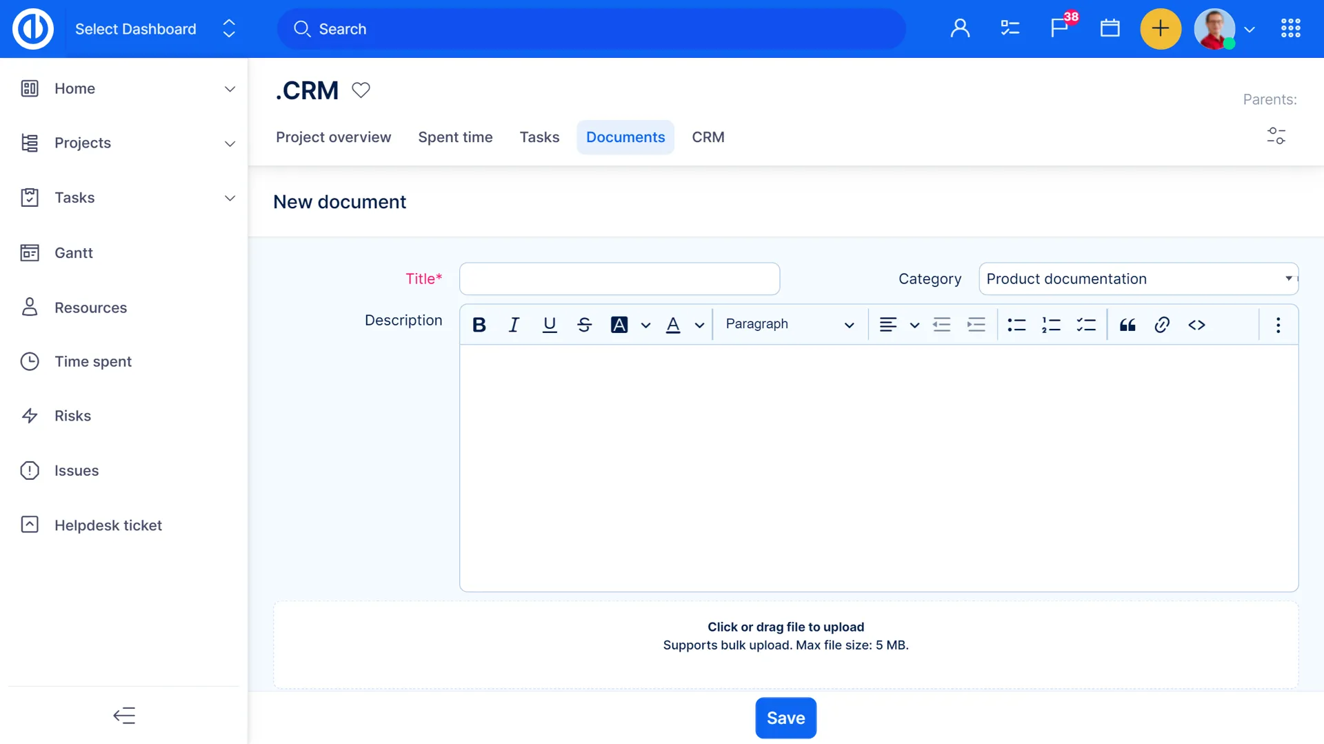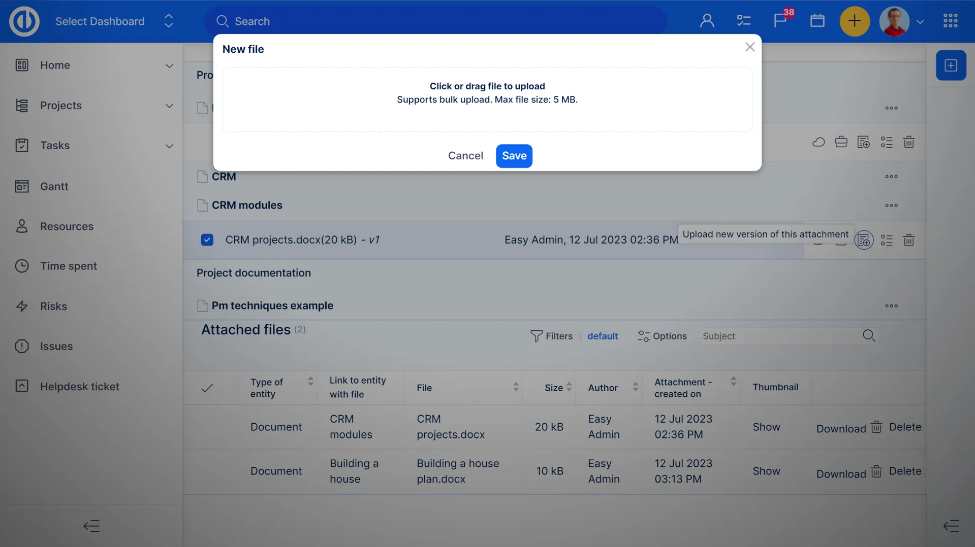 Documents can be attached to tasks and projects and then easily searched, versioned, and edited online. Under the Documents module you can find a complete overview of all the attachments from a specific project and tasks related to each of them.