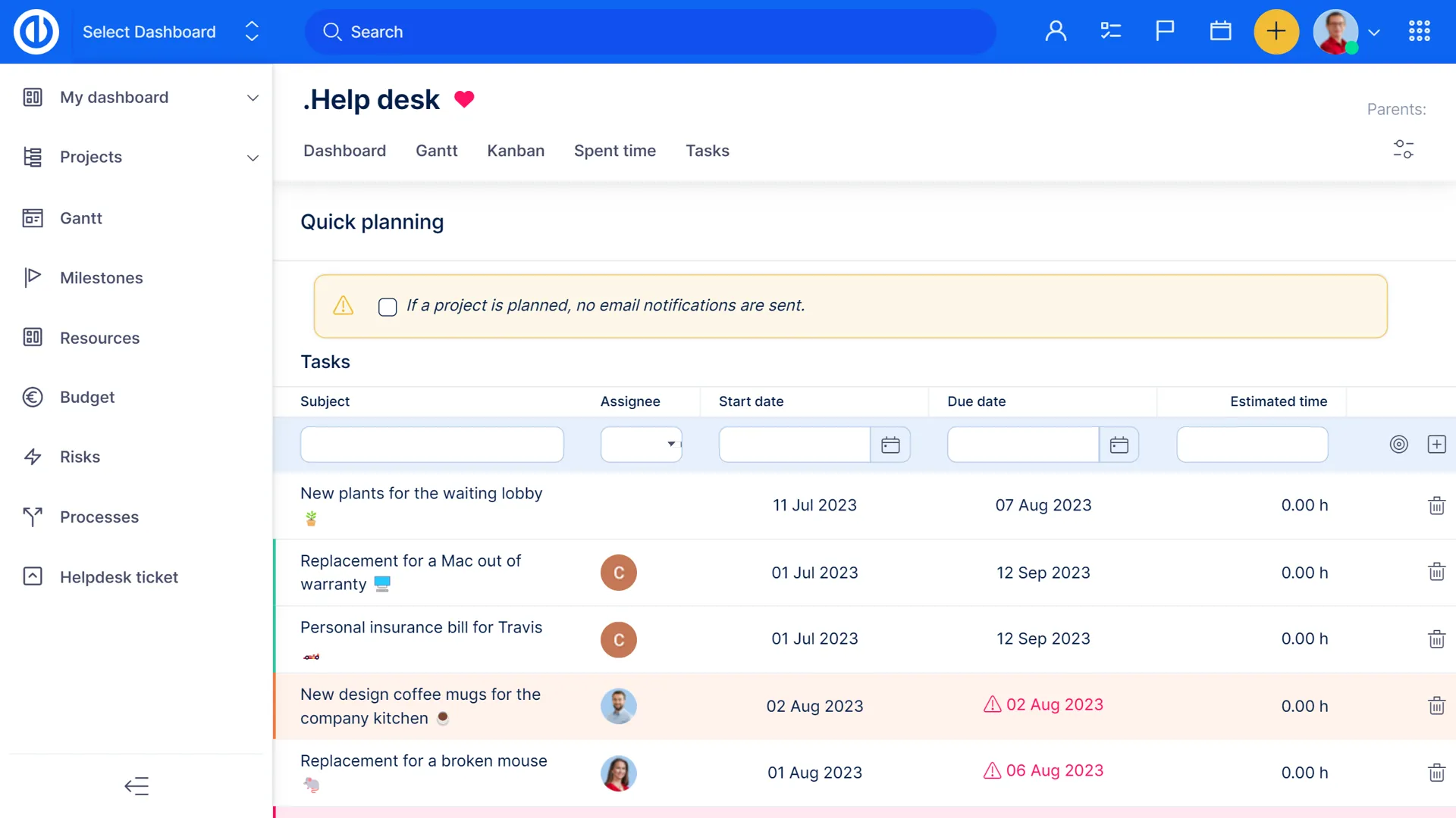 You set about what and when you want to be notified, and you will receive an e-mail notification at the right time. For example: a milestone deadline is approaching, a project/task budget is exceeded, tasks are past due.