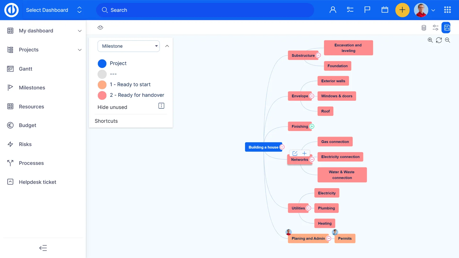 Mind Maps are used for better planning, brainstorming, and creation of project and process diagrams. You can use them to organize your thoughts about any project without having to create tasks. Unlike WBS, they are designed more for the initiation and analysis phase of a project when it is not yet necessary to create tasks and collaborate but, above all, to analyze and think about all parts of the project or process.