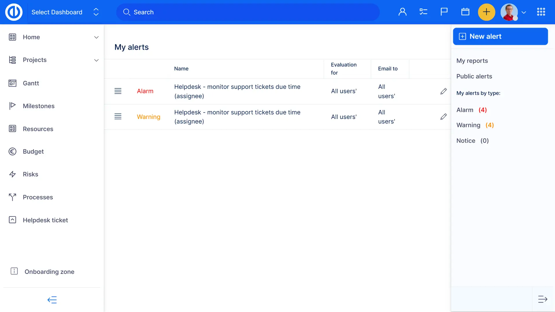 You set about what and when you want to be notified, and you will receive an e-mail notification at the right time. For example: a milestone deadline is approaching, a project/task budget is exceeded, tasks are past due.
