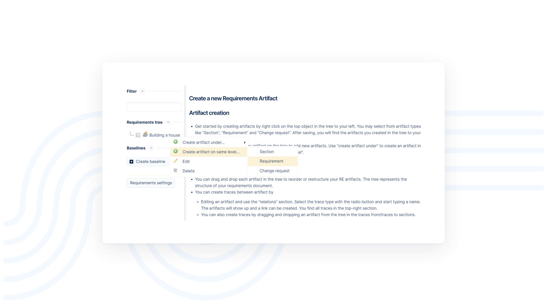 For technically advanced projects that require many small elements and details to create significant products, like vehicles or machinery, requirements management proves essential. You can effortlessly generate artifacts that reflect the essential attributes in the requirements' hierarchical structure.