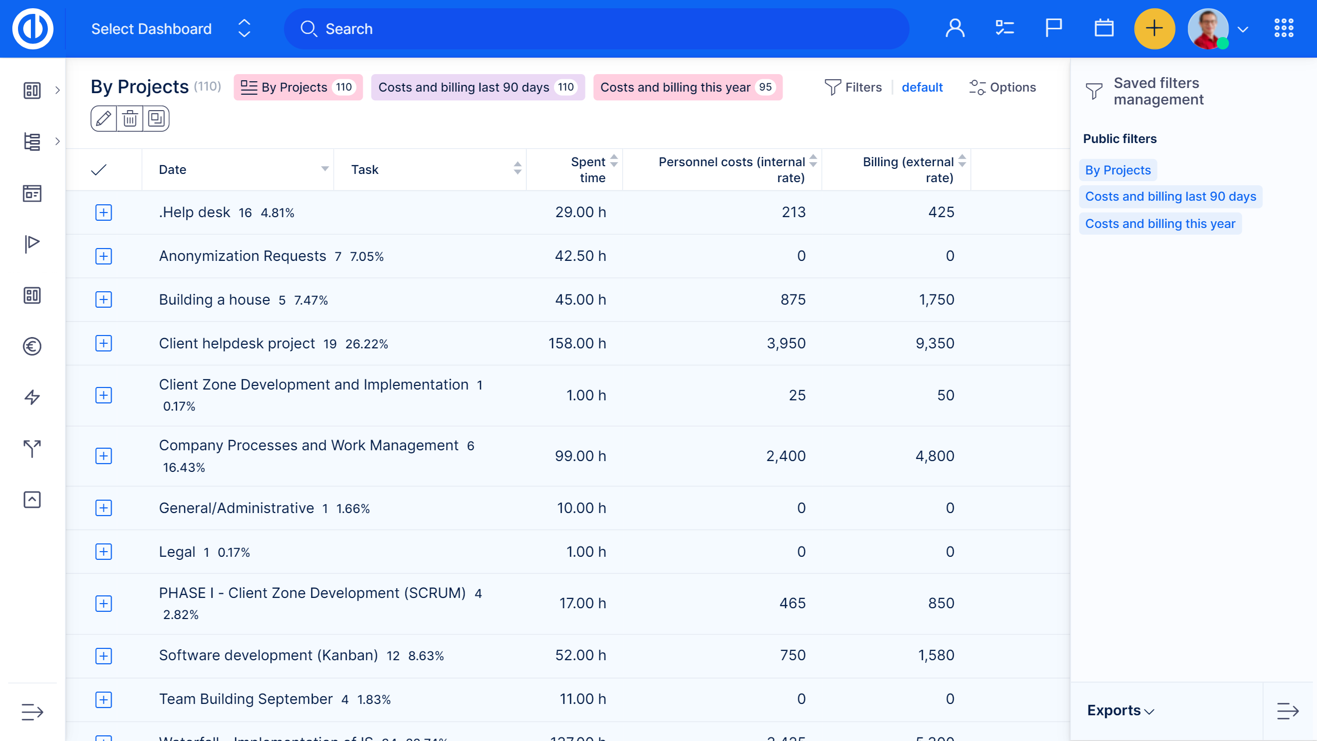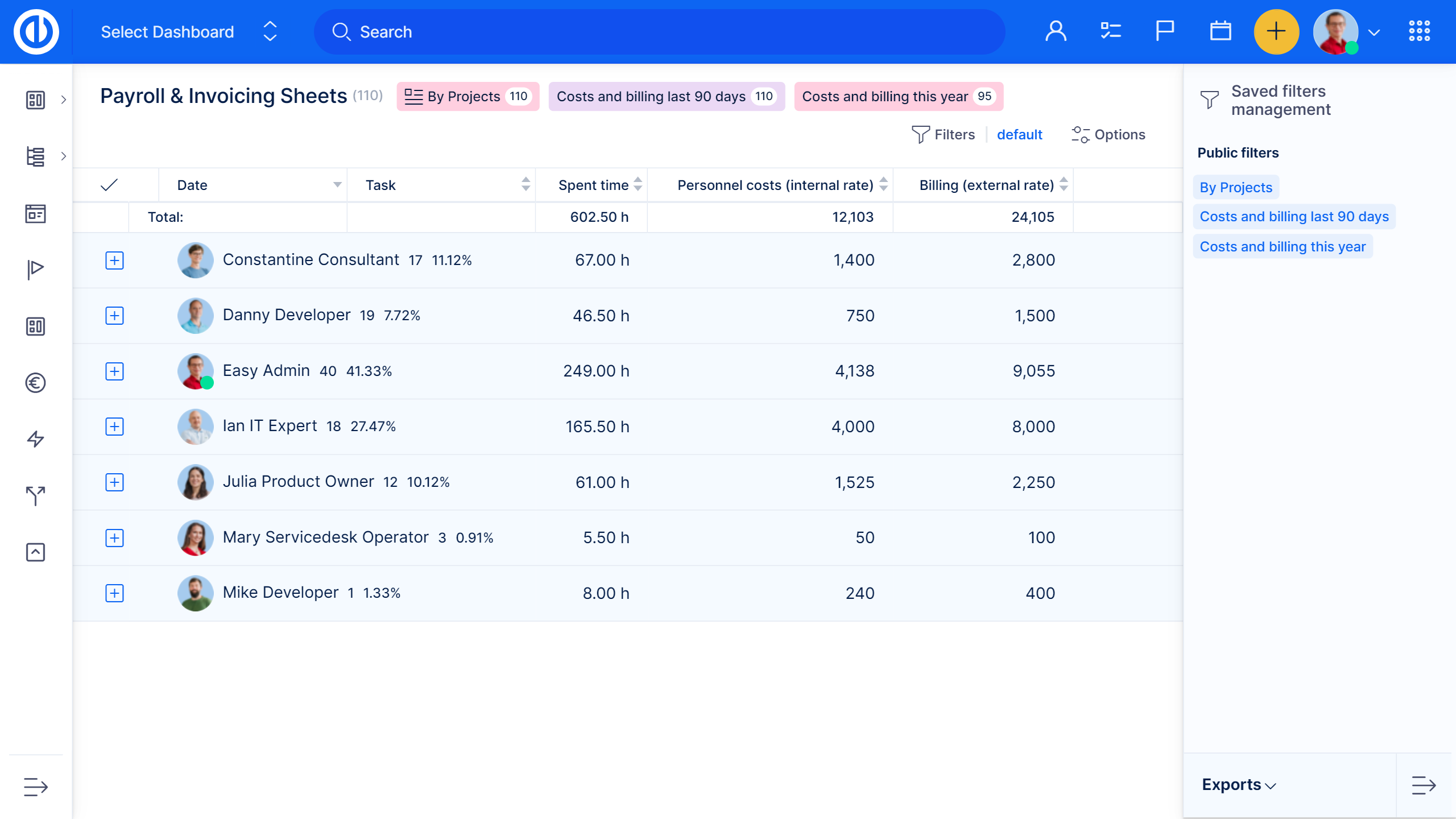 Easy Project позволяет оформлять счета и зарплатные ведомости на основании табелей рабочего времени и внутренних/внешних ставок. Благодаря интеграции с модулем контактов и CRM счета можно сразу отправить клиентам.
